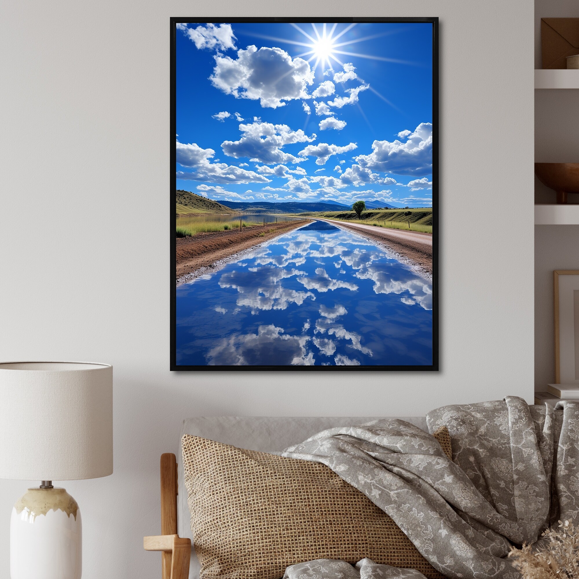 Designart "Blue Sky Reflection Over Road" Road Framed Wall Art Living Room
