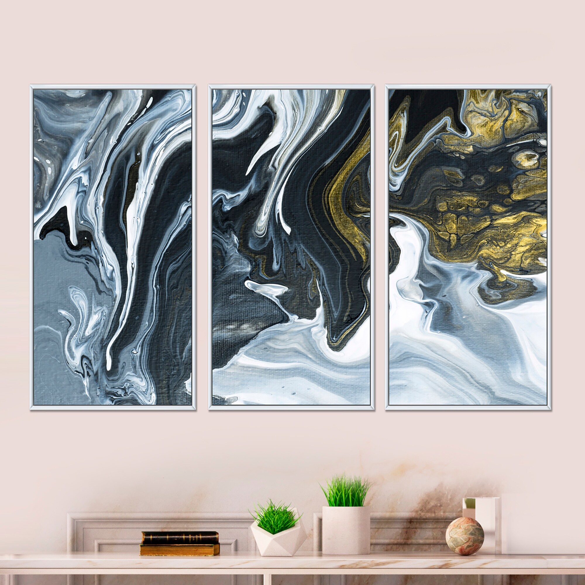 Designart "Yellow Marble River in Liquid Art Universe VI" Modern Framed Artwork Set of 3 - 4 Colors of Frames