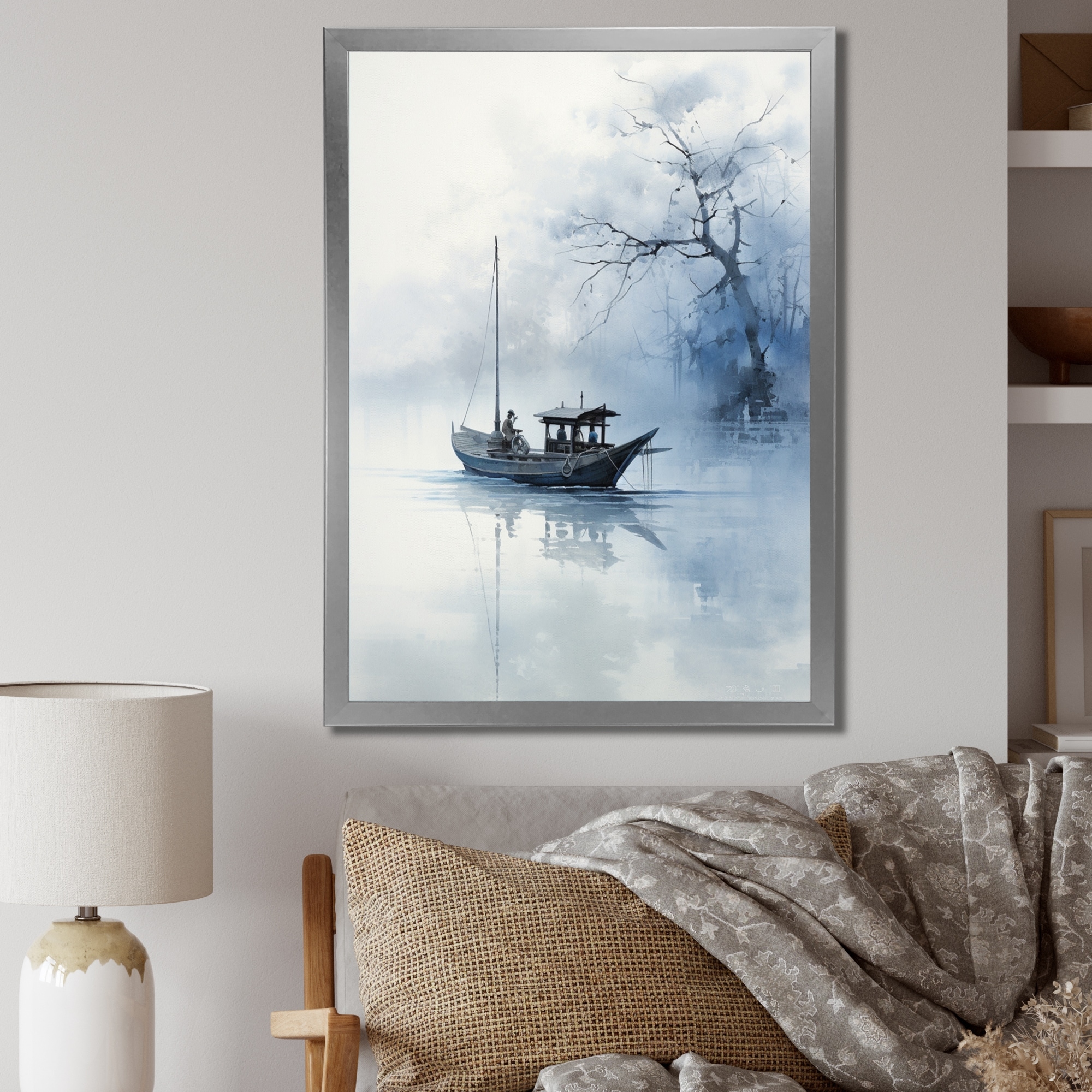 Designart "Asian Art Blue Boat Monocrhome" Asian Art Framed Wall Art Living Room