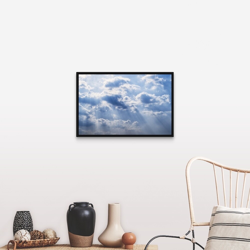 "Sun rays beaming through the clouds" Black Float Frame Canvas Art