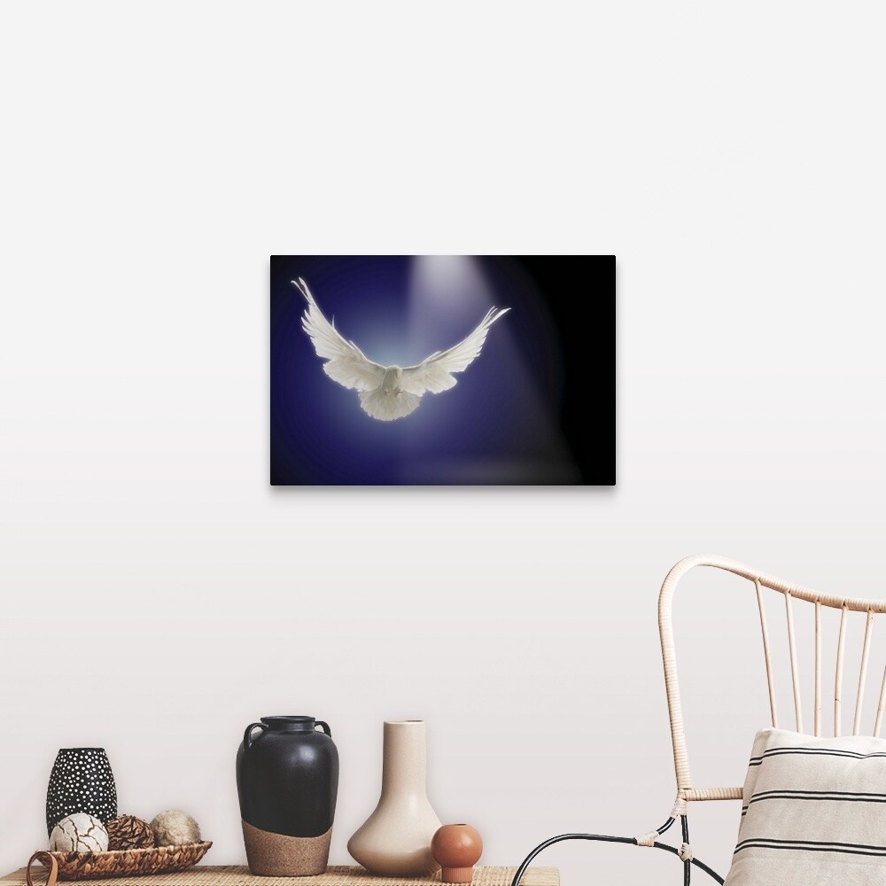 "Dove flying through beam of light" Canvas Wall Art