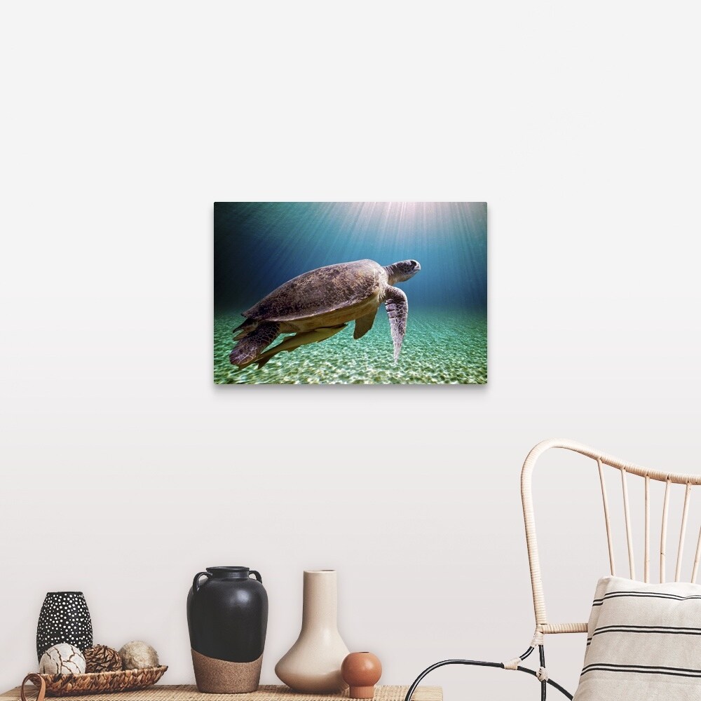 "Sun beams filtering through sea with green sea turtle." Canvas Wall Art