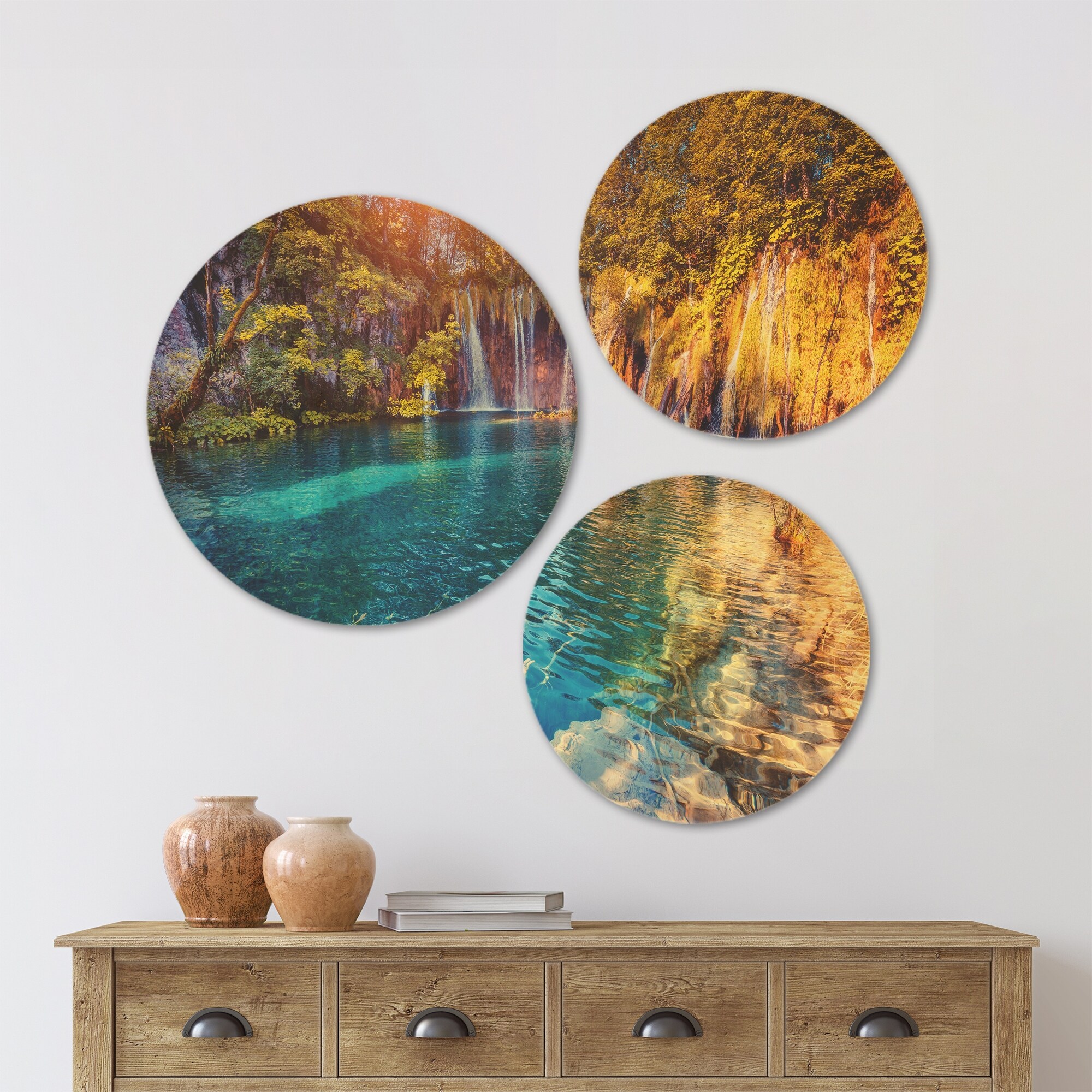 Designart 'Turquoise Water and Sunny Beams' Landscape Wood Wall Art Set of 3 Circles