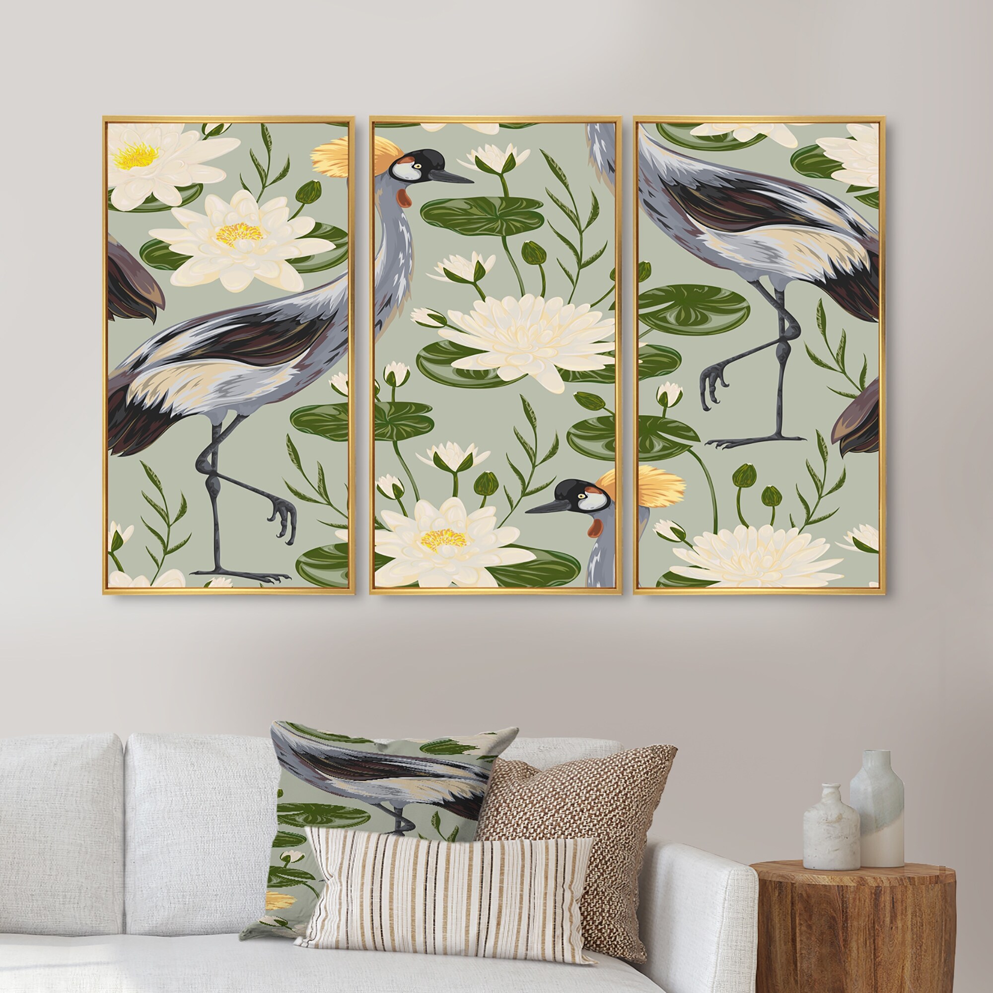 Designart "Crane Bird And Water Lilys on Grey" Patterned Framed Art Set of 3 - 4 Colors of Frames