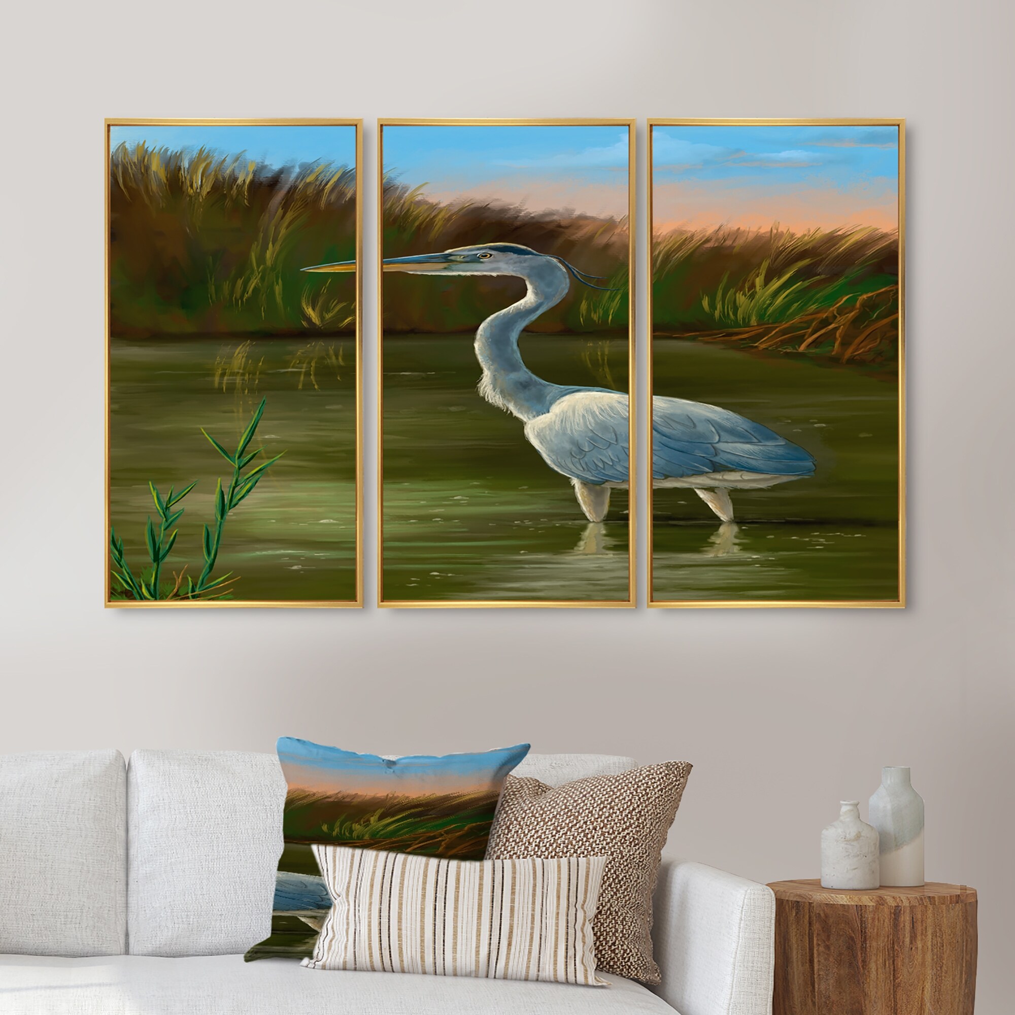 Designart "Blue Heron Wetland Bird" Traditional Framed Artwork Set of 3 - 4 Colors of Frames