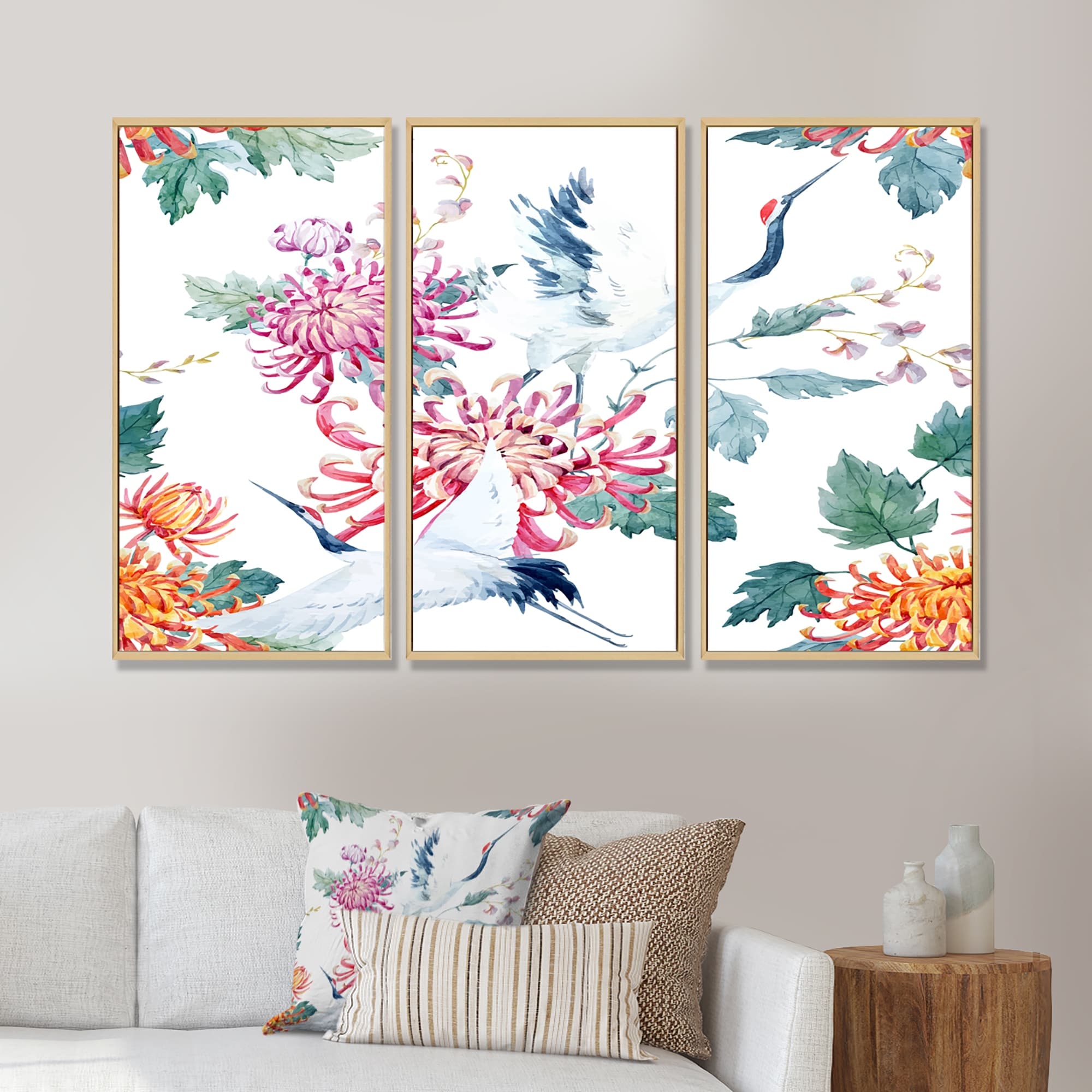 Designart "Crane Bird With Flowers And Plants" Patterned Framed Art Set of 3 - 4 Colors of Frames