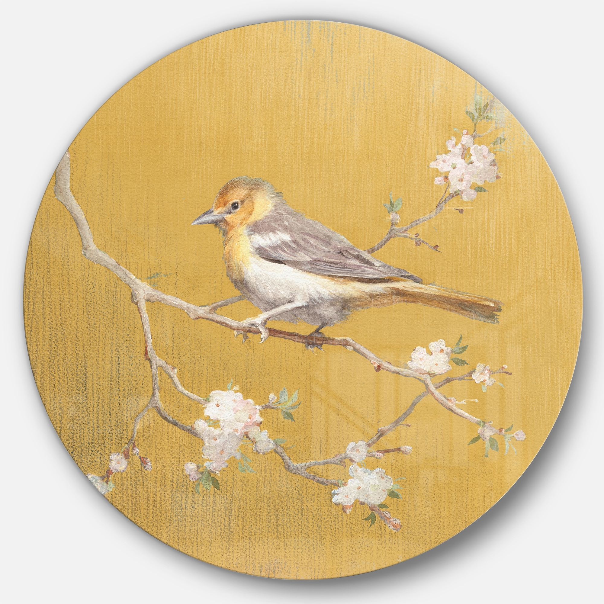 Designart 'Gold Bird on Blossoms I' Farmhouse Metal Circle Wall Art