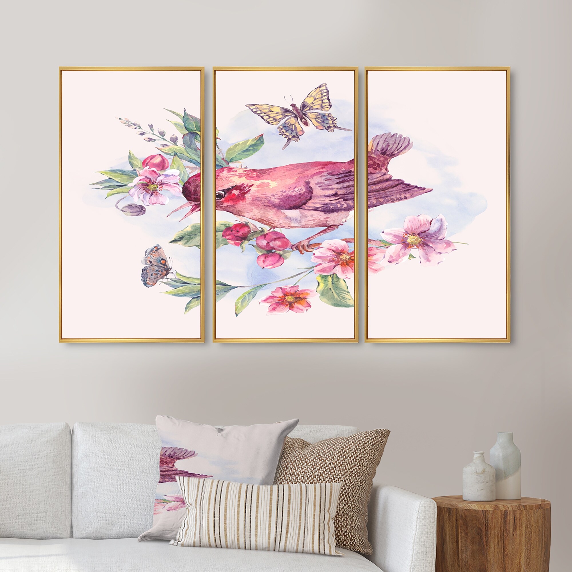 Designart "Pink Bird on A Blooming Branch" Traditional Framed Canvas Wall Art Print Set of 3 - 4 Colors of Frames