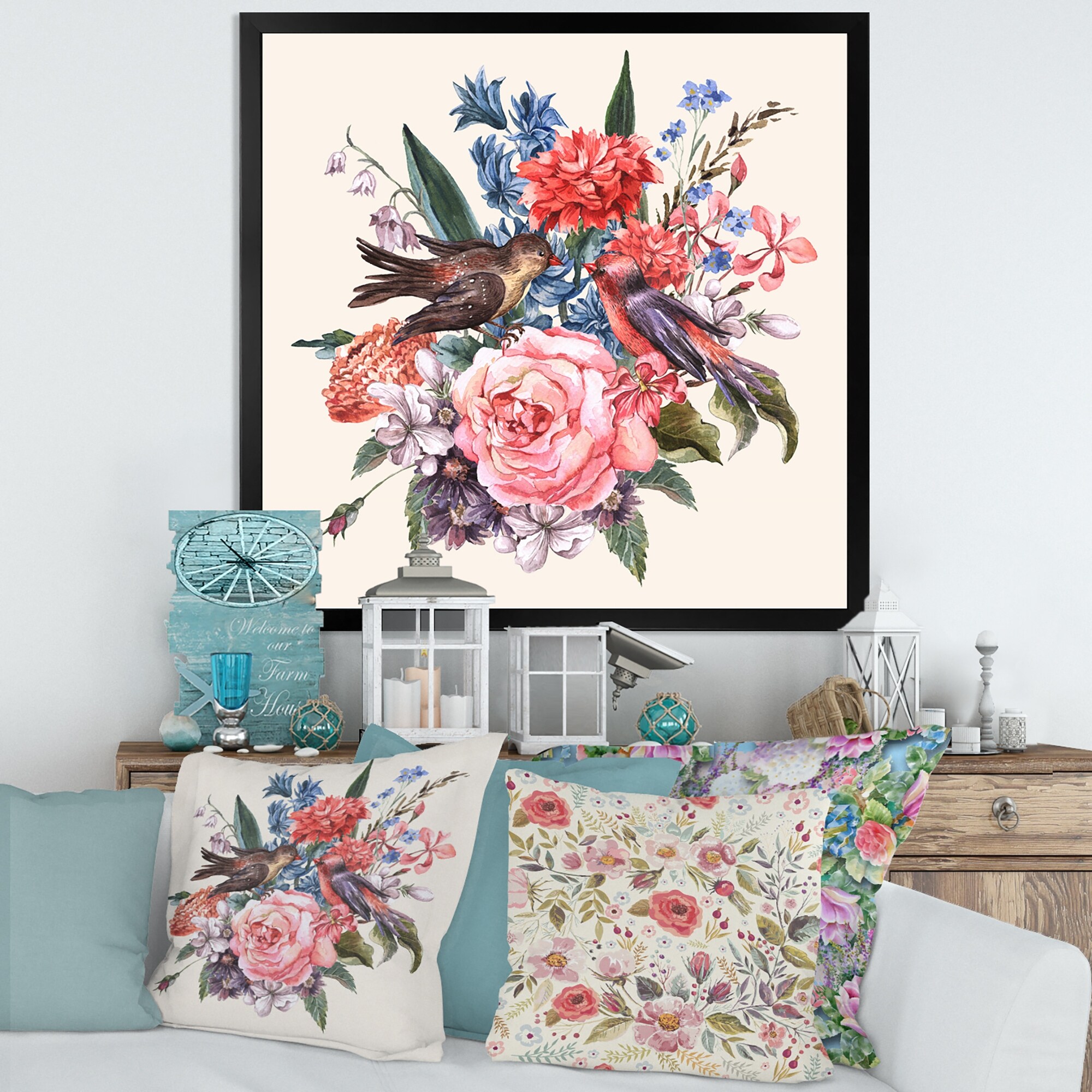 Designart "Floral Bouquet With Roses Hyacinths And Birds" Traditional Framed Art Print