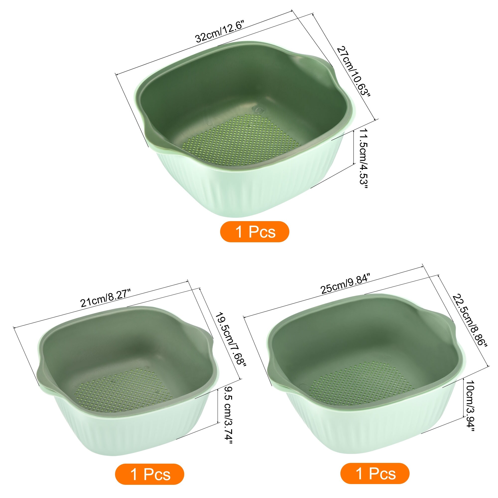 Kitchen Colander Bowl Set 3PCS, Washing Bowl & Strainer Double Layered - 32x27x11.5cm, 25x22.5x10cm, 21x19.5x9.5cm