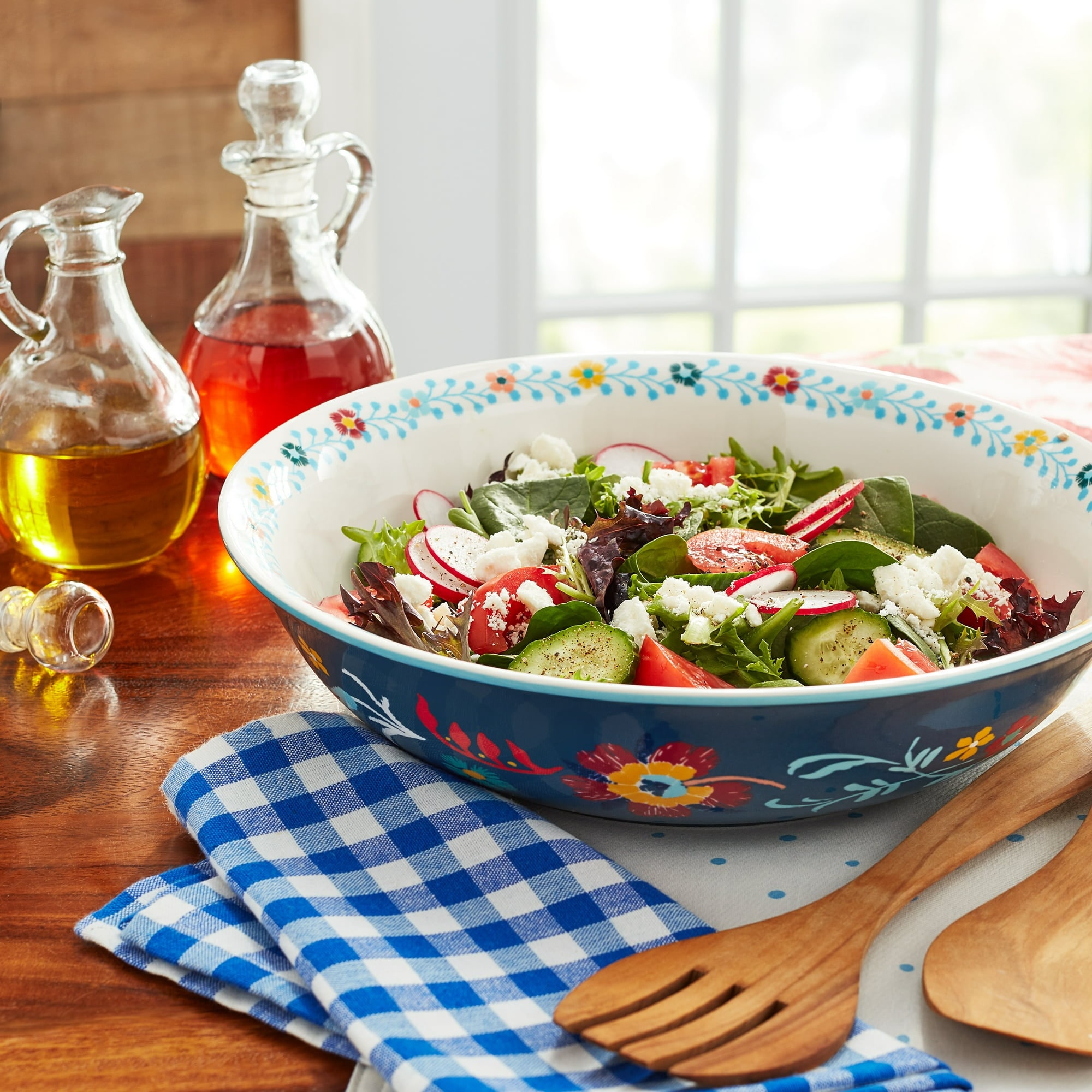 Hand Painted Stoneware Bowl with Floral Design - 14.0"L x 14.0"W x 2.3"H