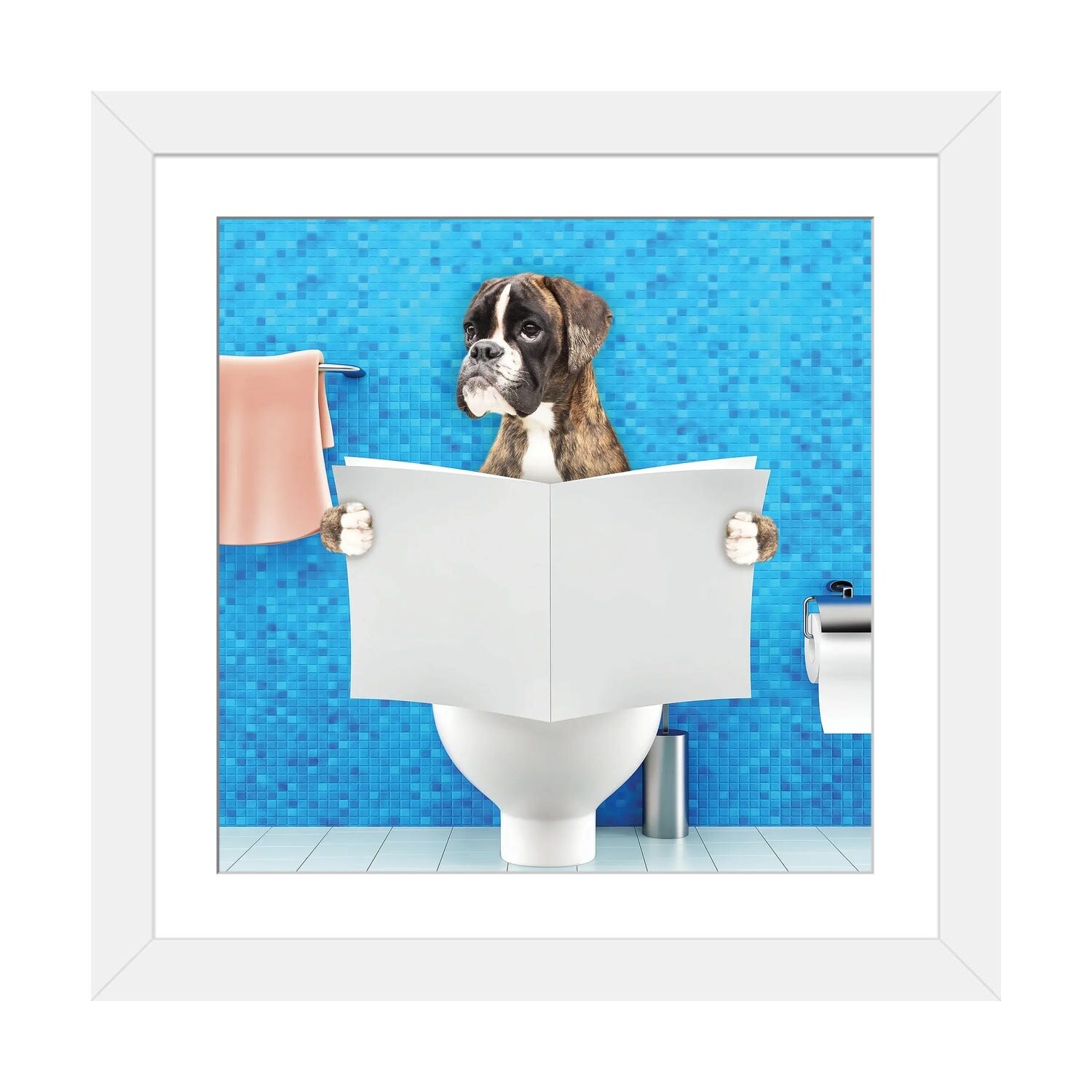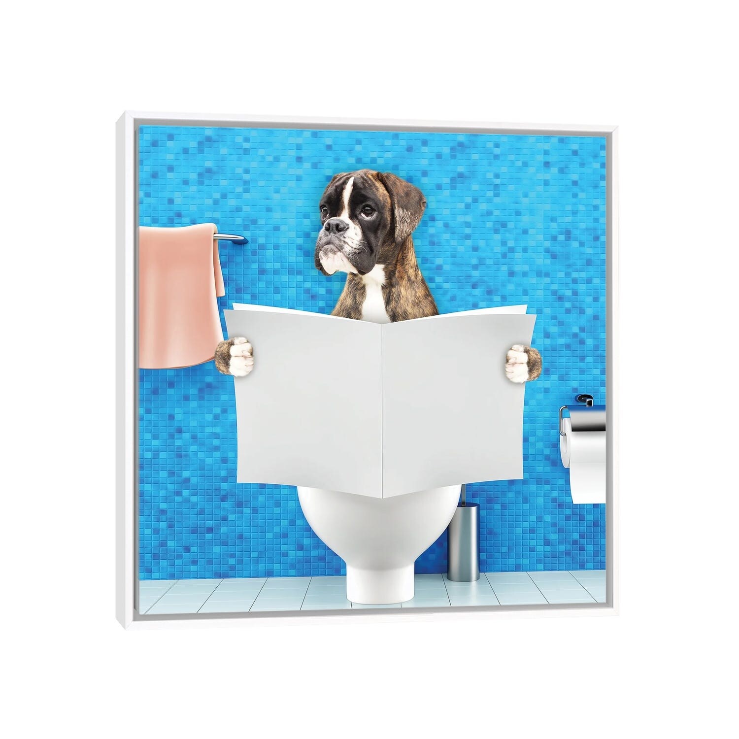 iCanvas "Boxer Sitting on A Toilet Seat Reading" by helga1981 Framed Canvas Print