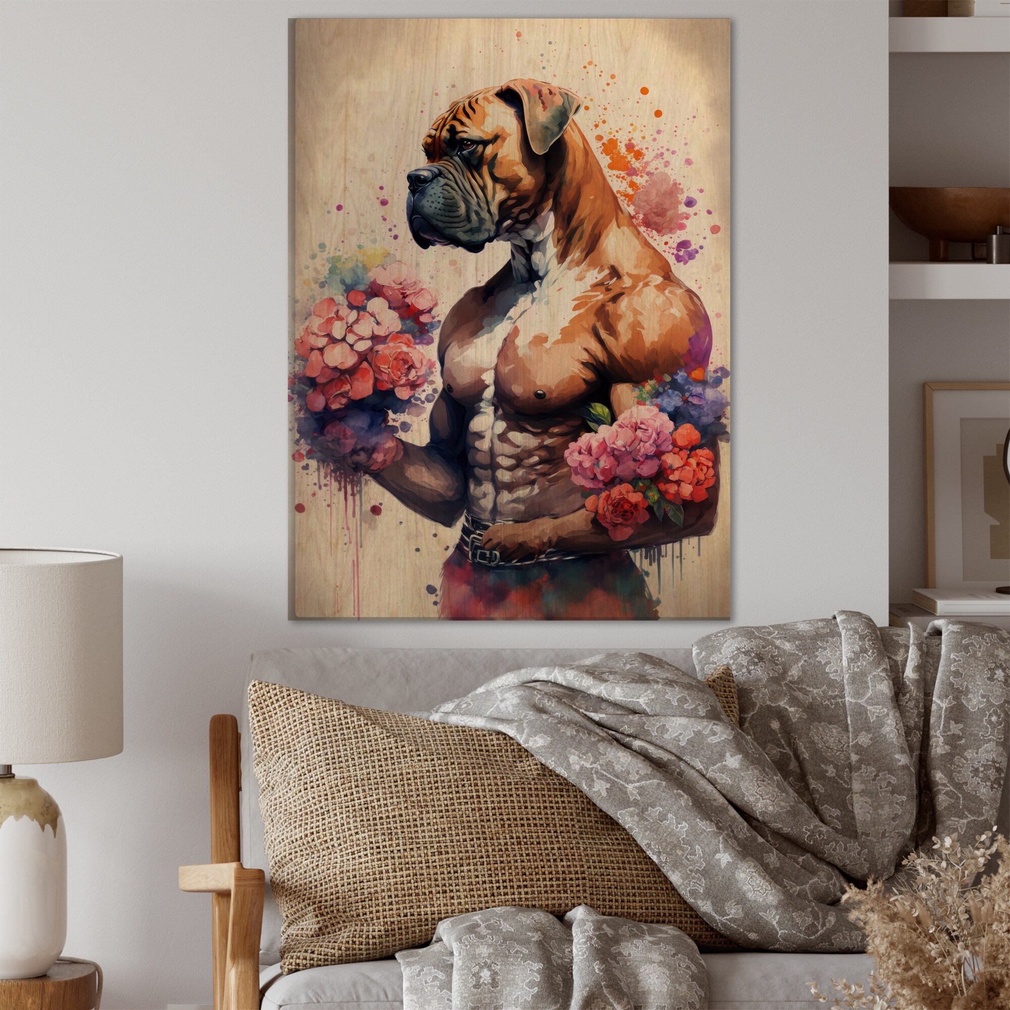 Designart "Cute Boxers Floral Art" Animals Dog Wood Wall Art - Natural Pine Wood