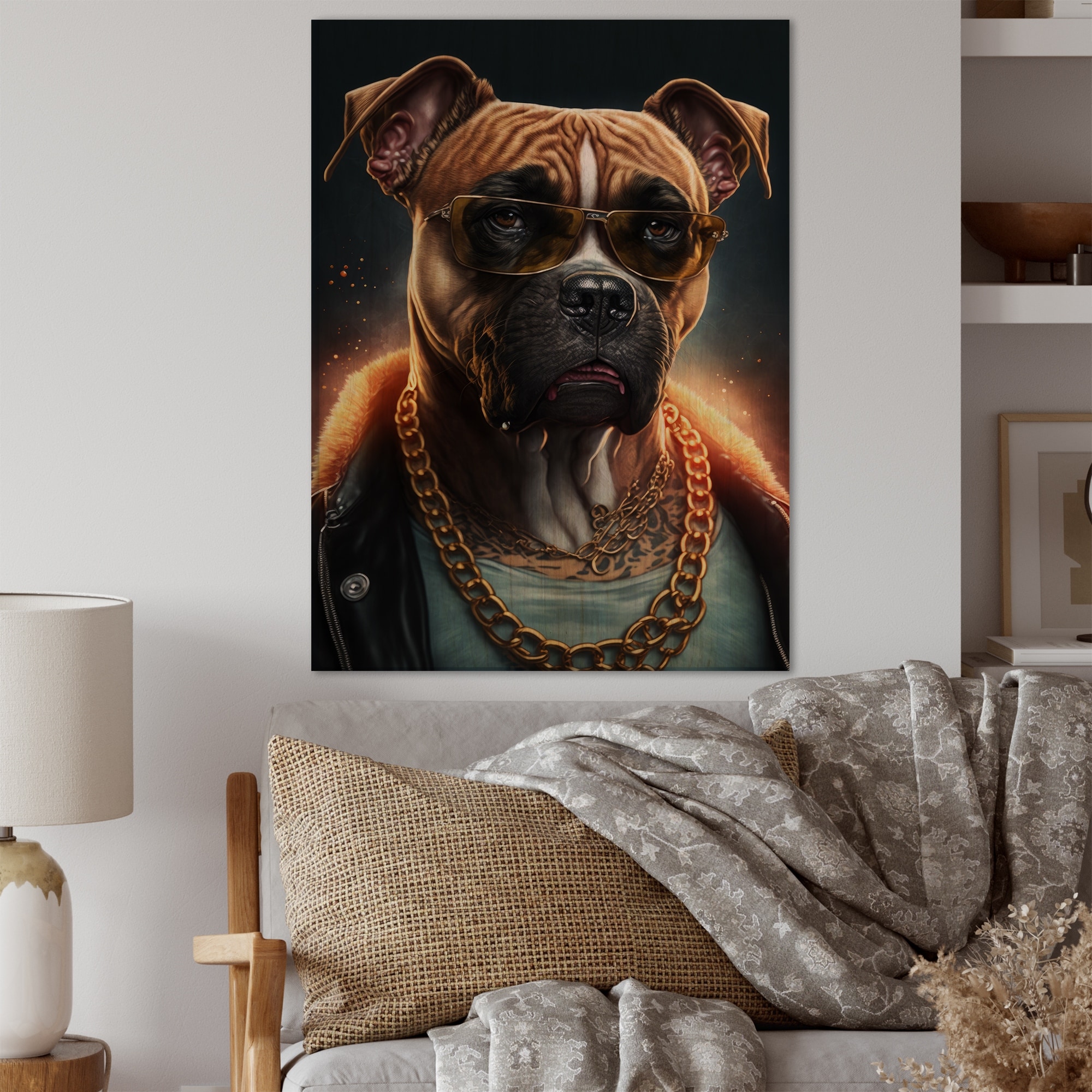 Designart "Boxer Gangster in NYC II" Animals Dog Wood Wall Art - Natural Pine Wood