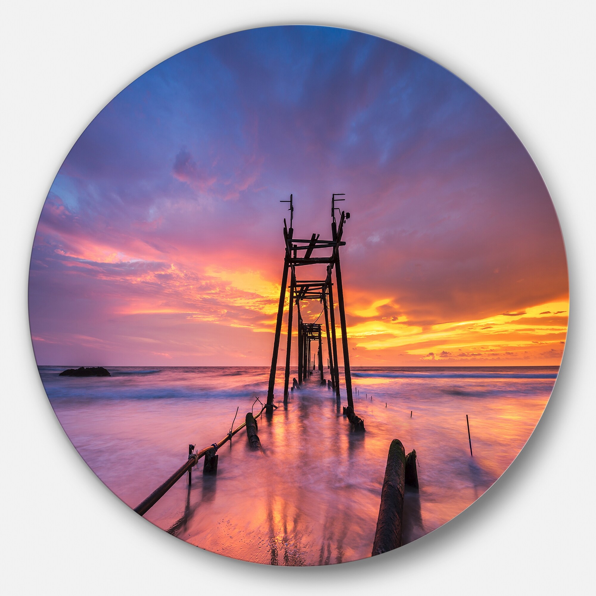 Designart 'Broken Wooden Bridge at Sunset' Sea Pier and Bridge Round Metal Wall Art