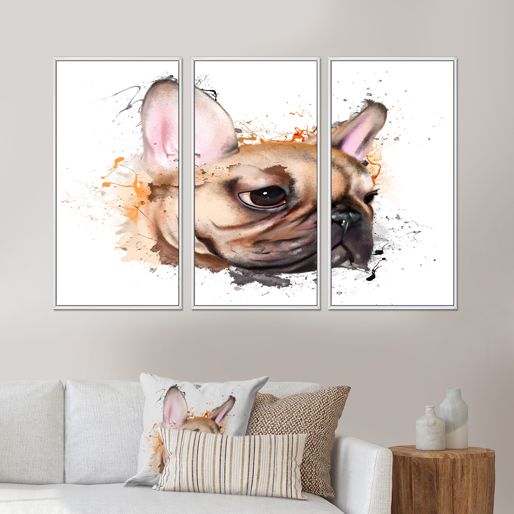 Designart "Brown Watercolor French Bulldog" Animal Framed Canvas Wall Art Set of 3 - 4 Colors of Frames