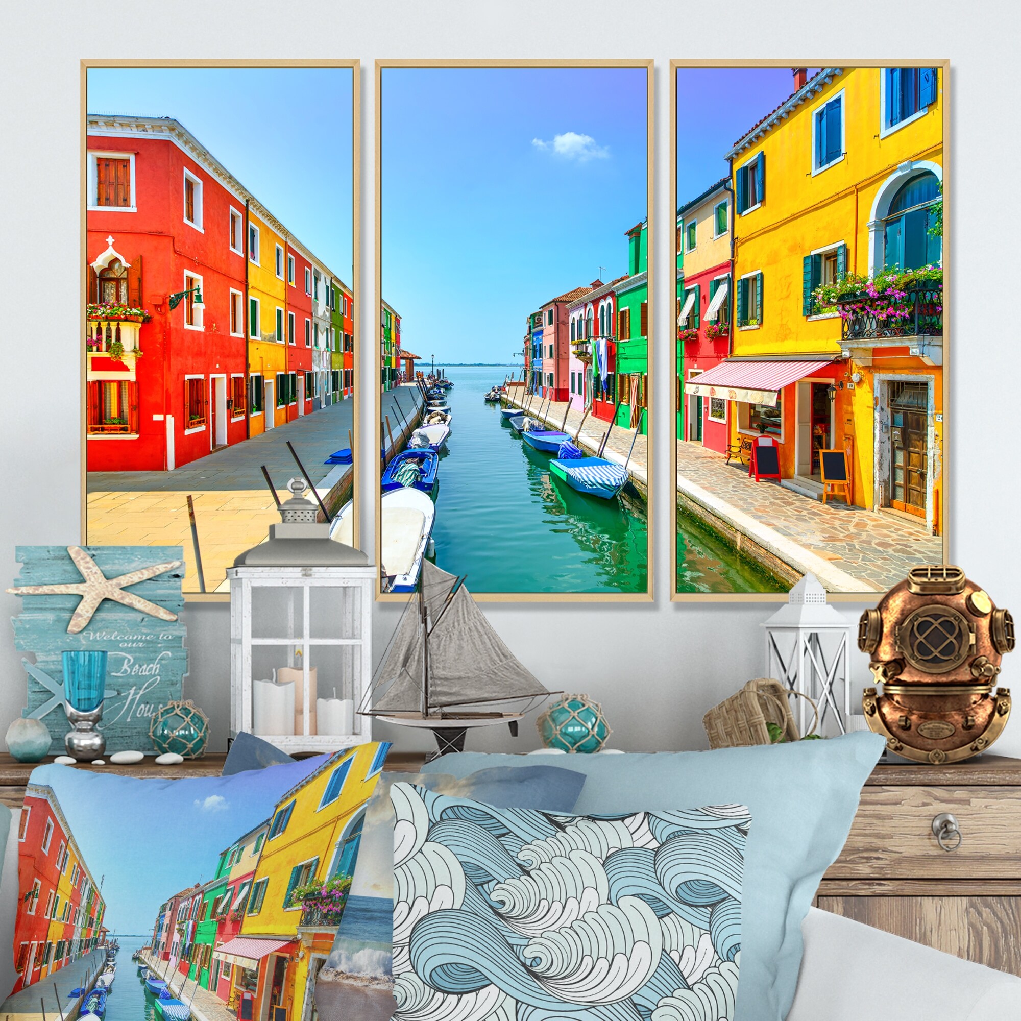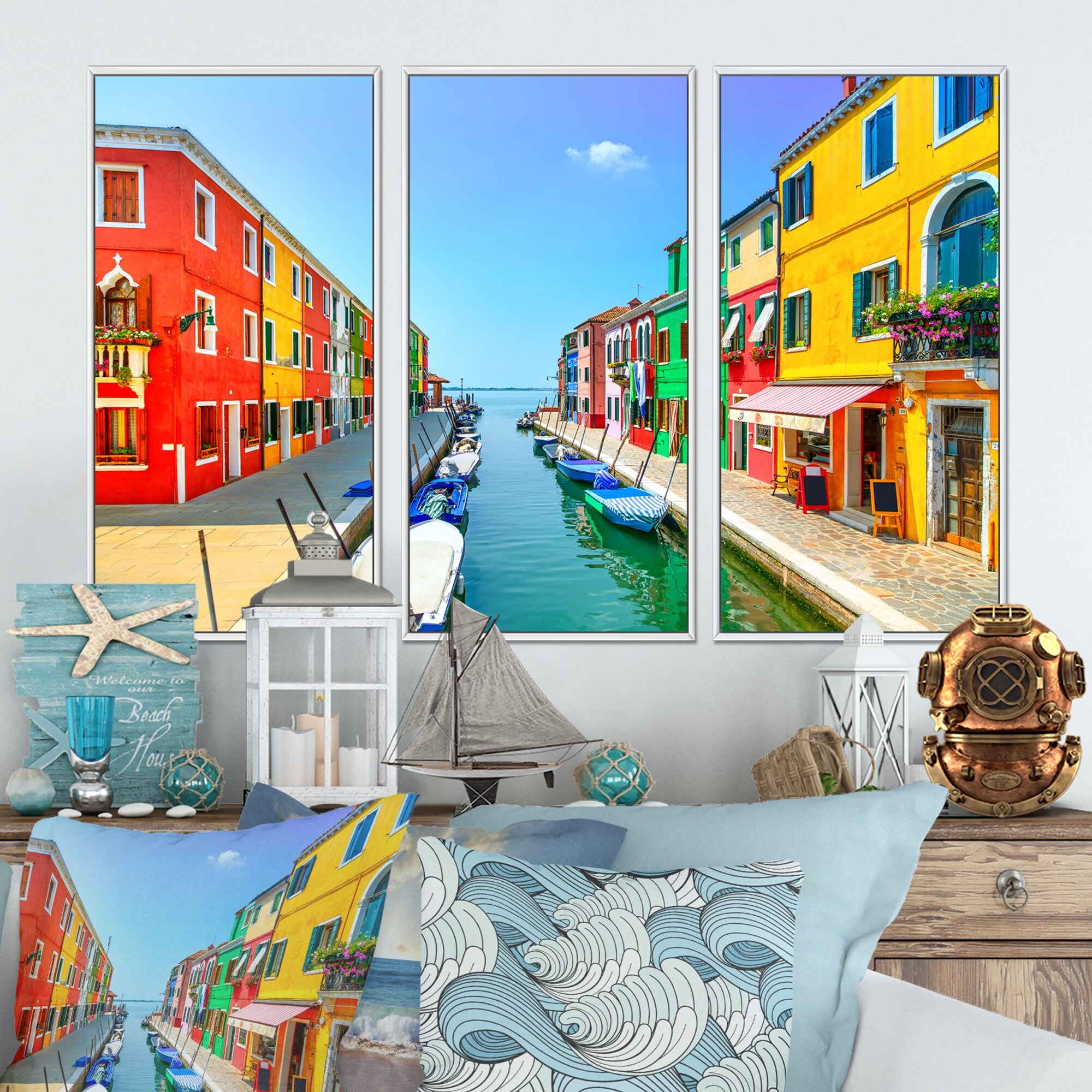 Designart "Colorful Burano Island Canal Venice" Landscape Framed Art Prints Set of 3 - 4 Colors of Frames