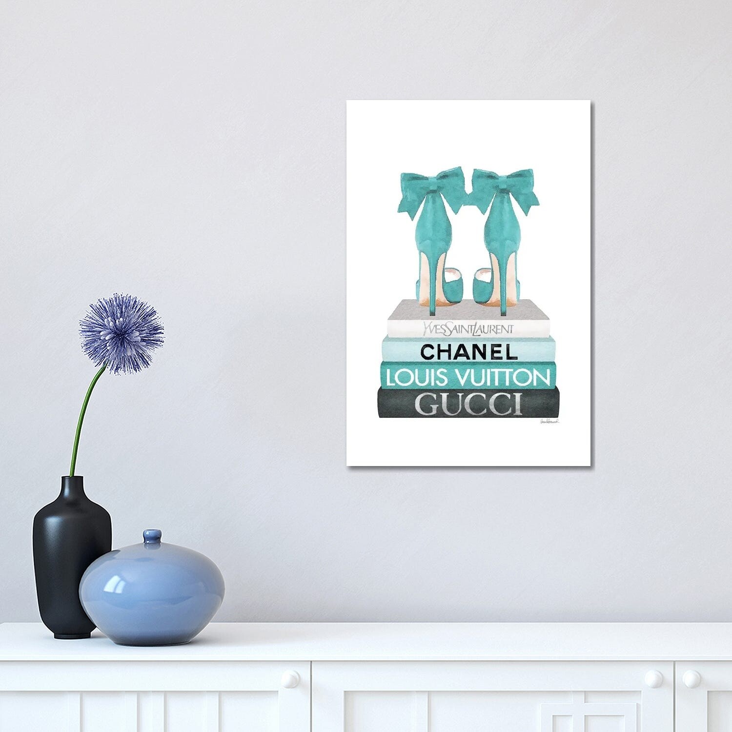 iCanvas "Tall Book Stack in Turquoise With Bow Shoes" by Amanda Greenwood