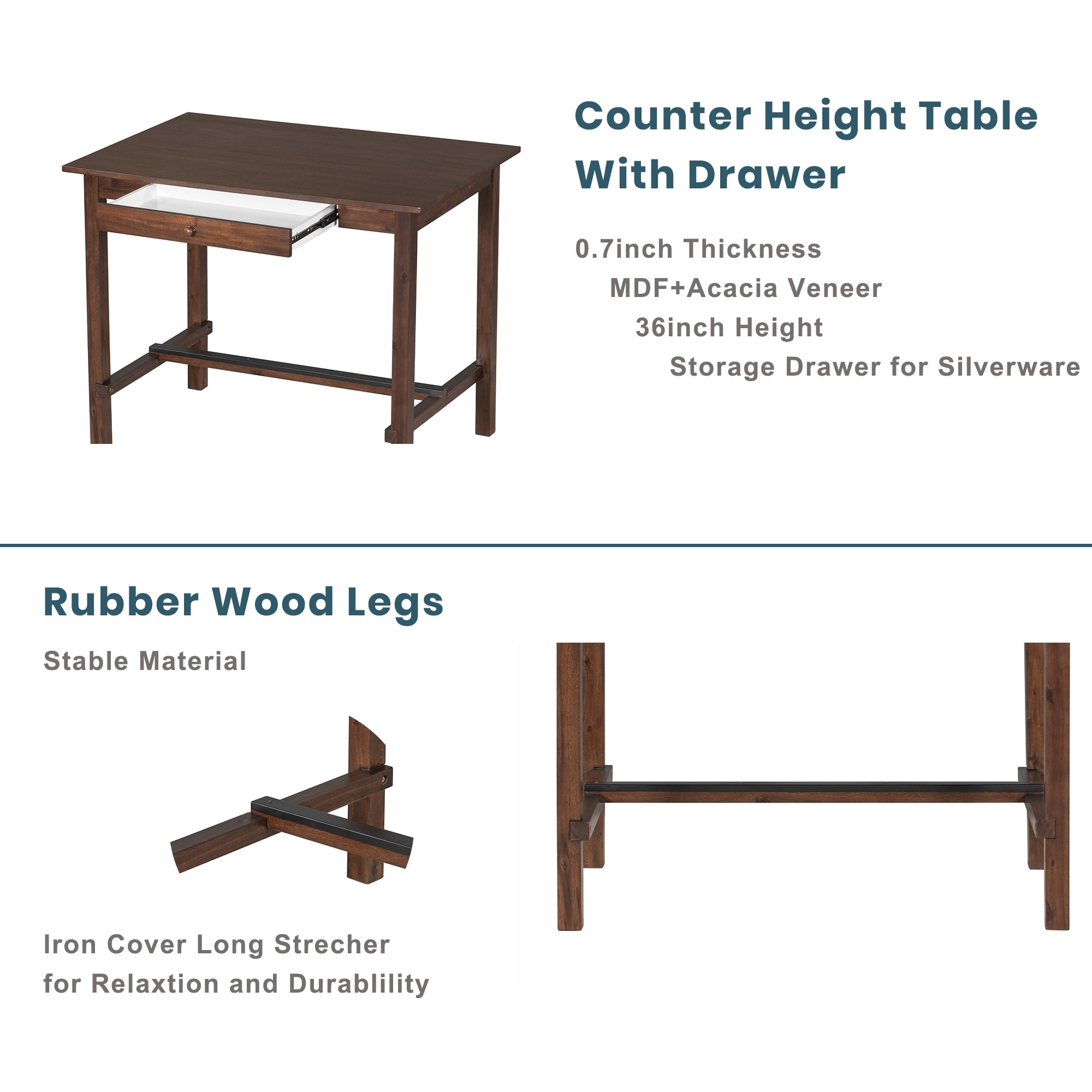 Walnut Casual 5-Piece Table Set, Solid Wood Counter Height Dining Set with Storage Drawer