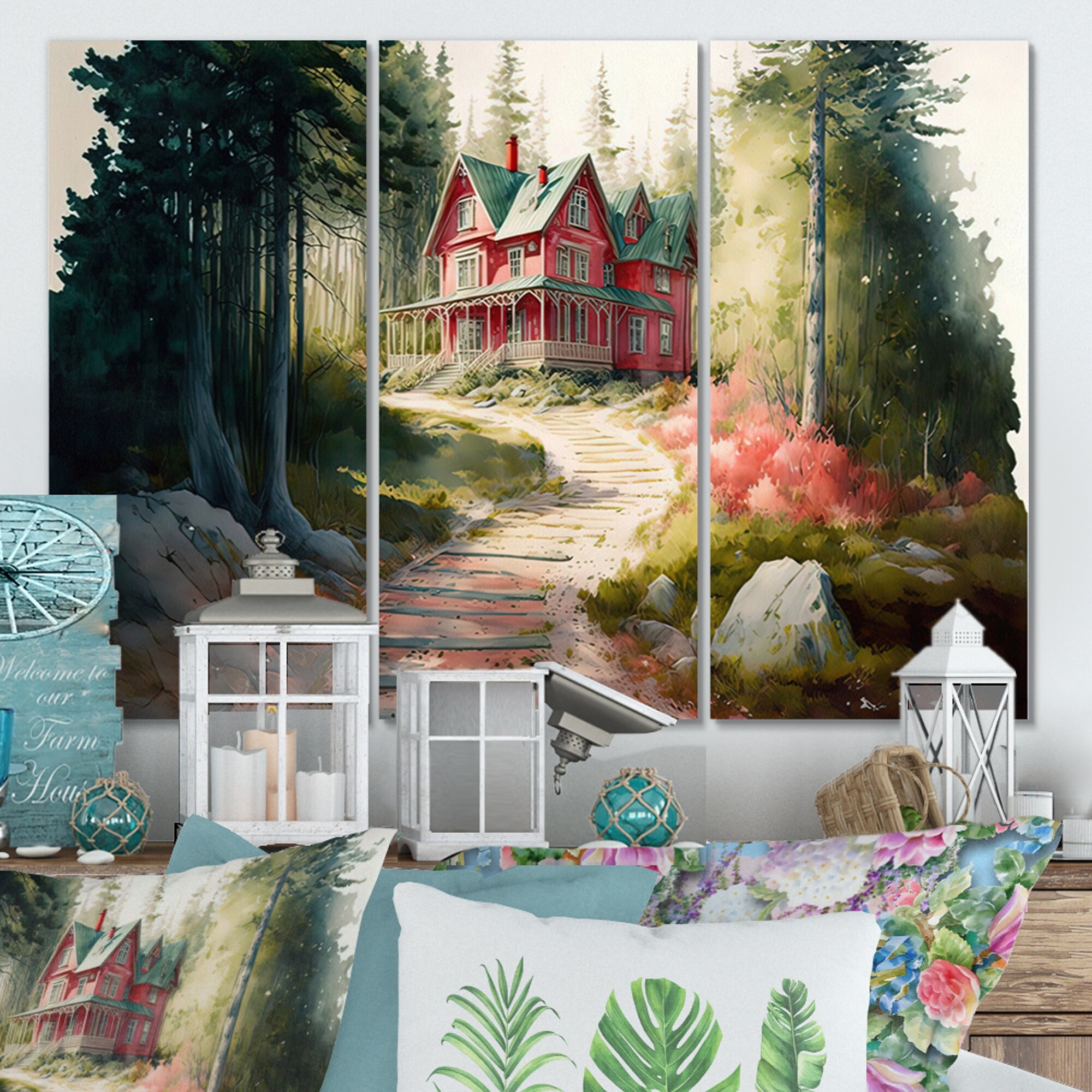 Designart "Charming Red Cottage IV" Farmhouse / Country Canvas Wall Art - 3 Panels