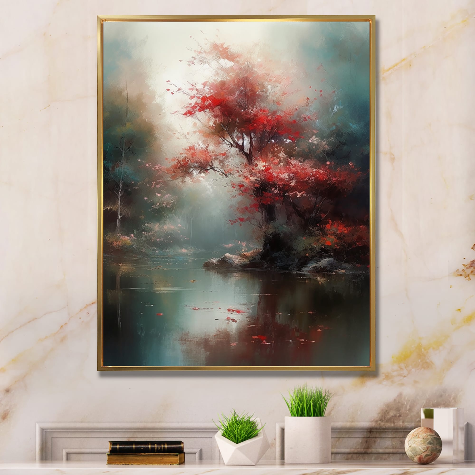 Designart "Red Charming Cherry Lilly" Tree Cherry Blossom Framed Wall Decor