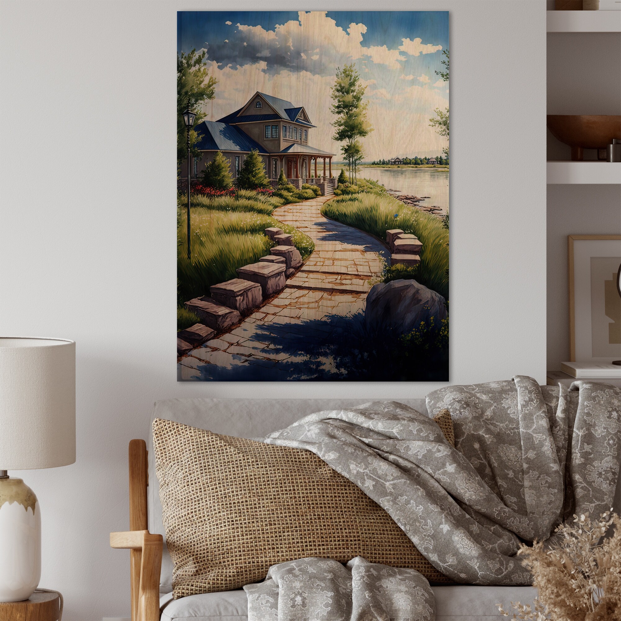 Designart 'Charming Cottage on the Water I' Lake House Cottage Wood Wall Art - Natural Pine Wood