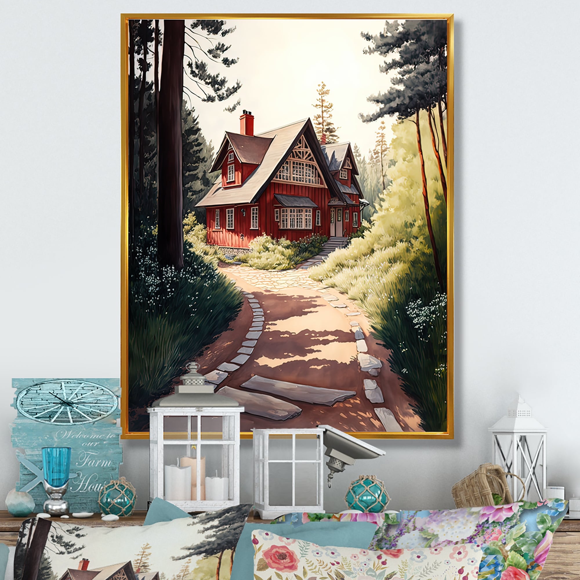 Designart "Charming Red Cottage I" Farmhouse / Country Framed Canvas Art Print