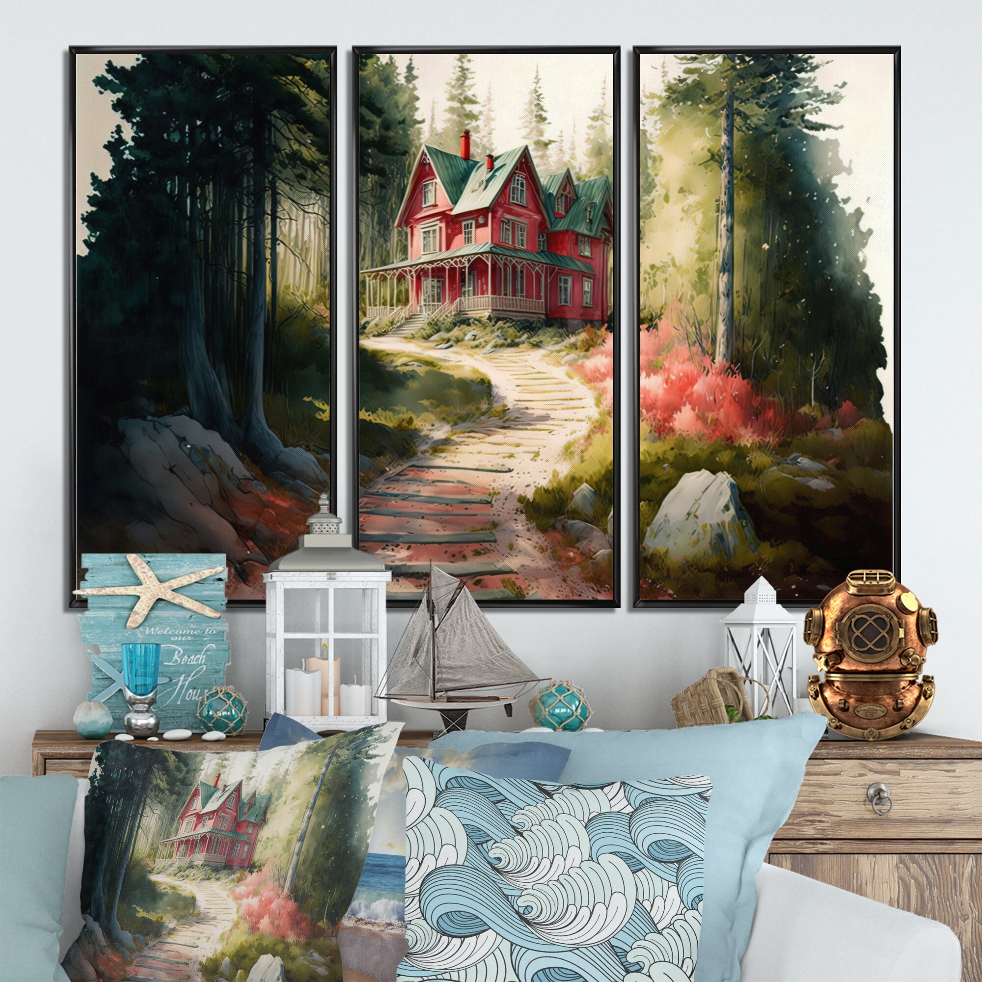Designart "Charming Red Cottage IV" Farmhouse / Country Framed Canvas Art Print - 3 Panels