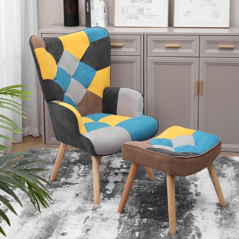 Creative Splicing Cloth Surface Accent Chair with Ottoman, Comfy Side Armchair for Bedroom Livingroom