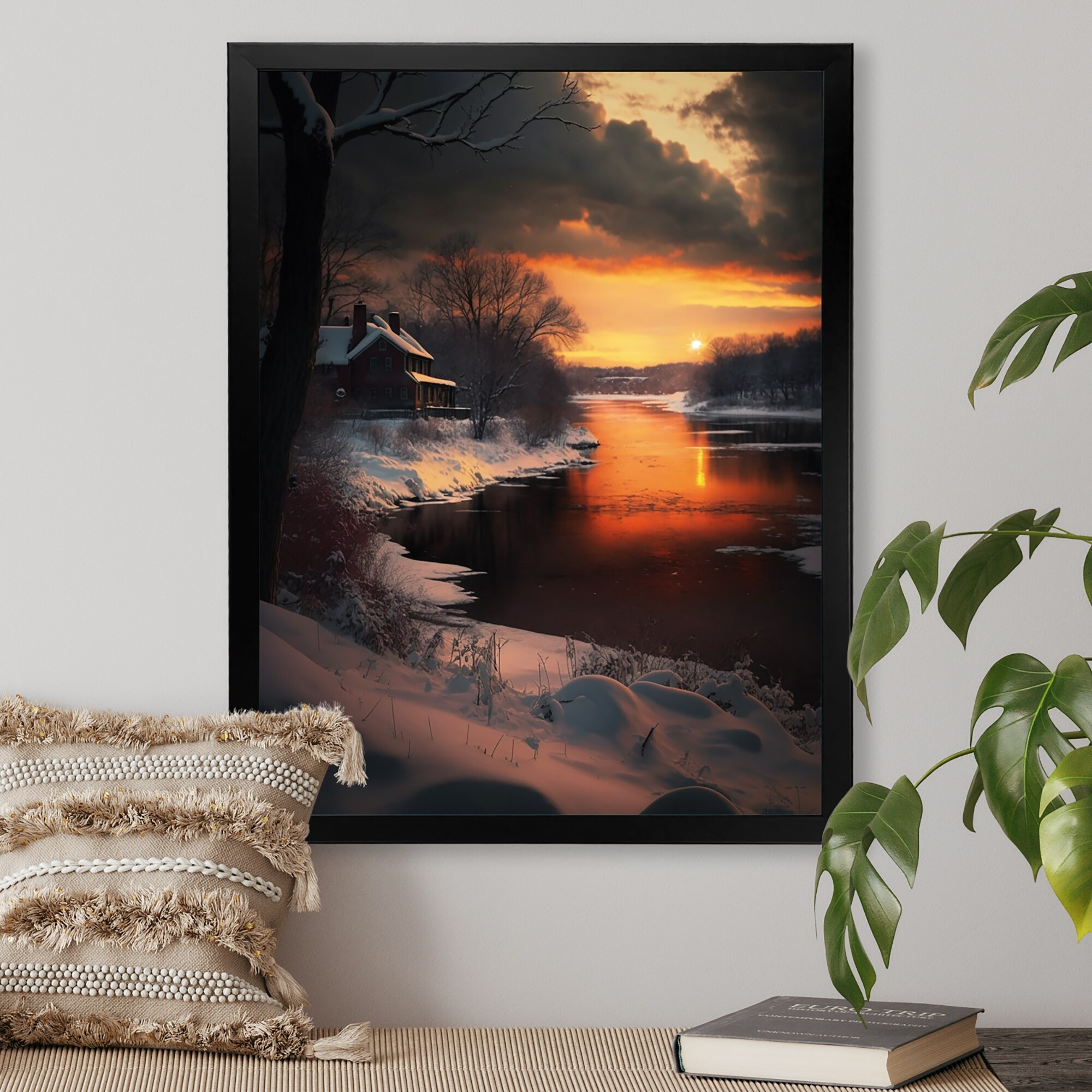 Designart "Sunset of the Snowy Cottage River IV" Landscape Lake Framed Art Print
