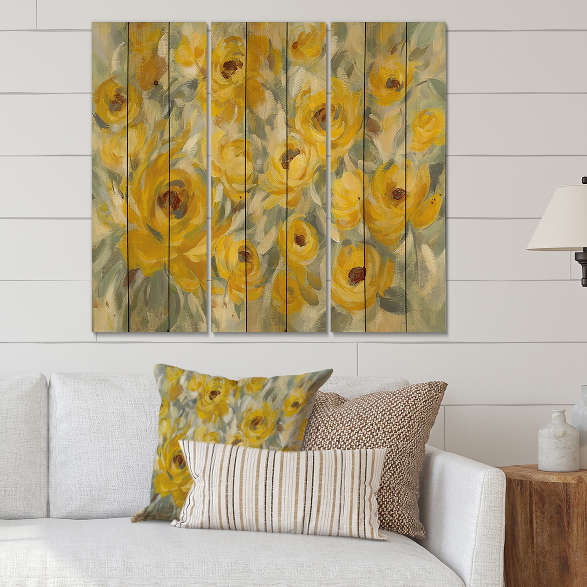 Designart 'Yellow Roses' Cottage Print on Natural Pine Wood - 3 Panels