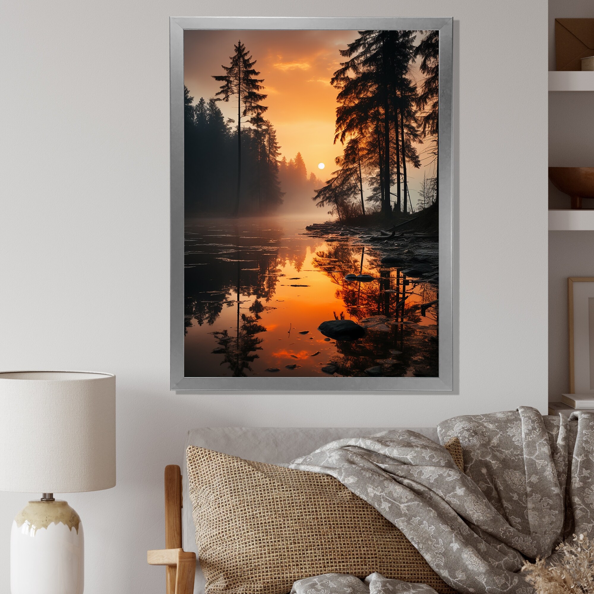 Designart "Orange Lake Misty Morning Reflections I" Lake House Cottage Framed Wall Decor