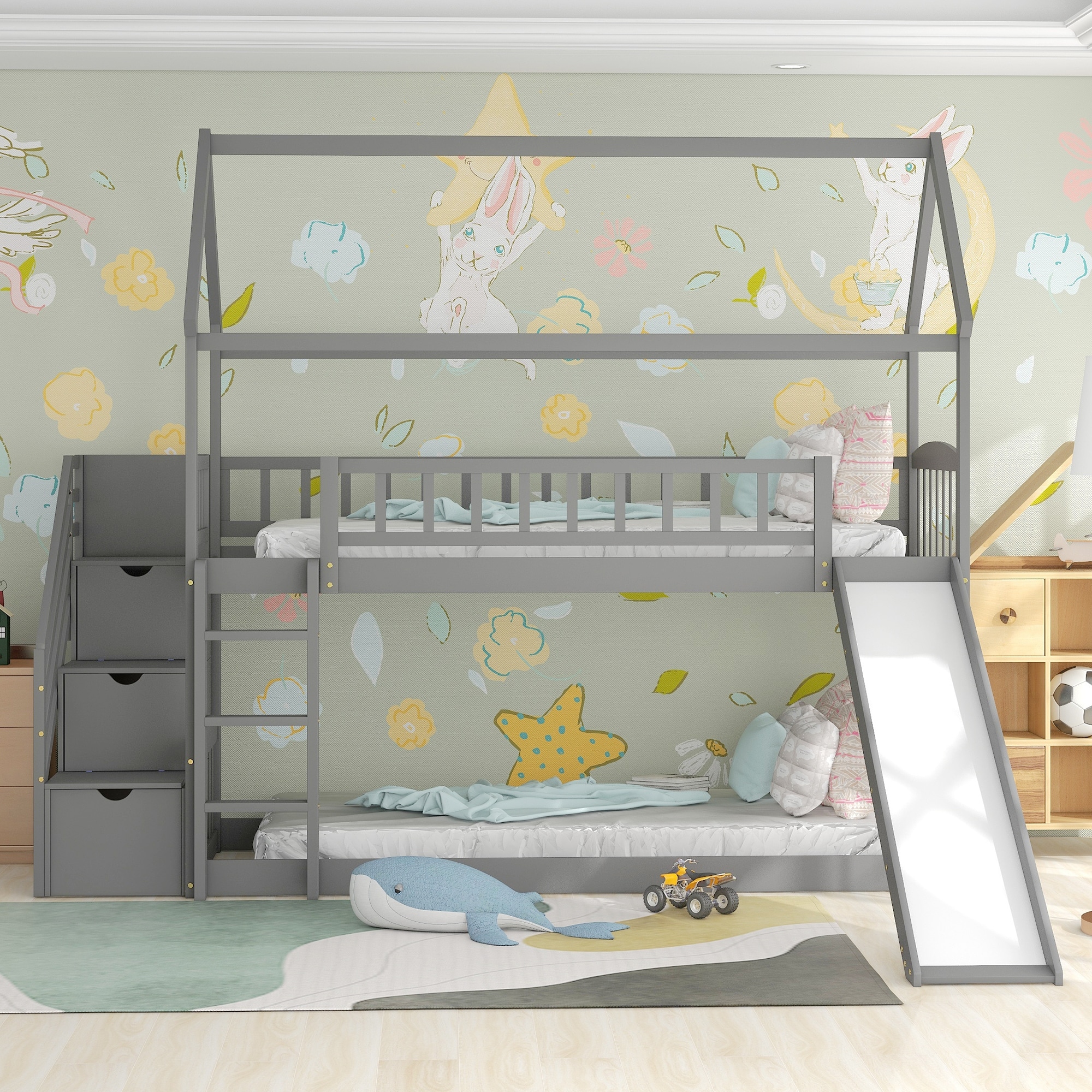 Gray Twin Over Twin Bunk Bed with Drawers and Slide, House Bed with Slide, Solid Pine Legs, Storage Steps and Playhouse Design