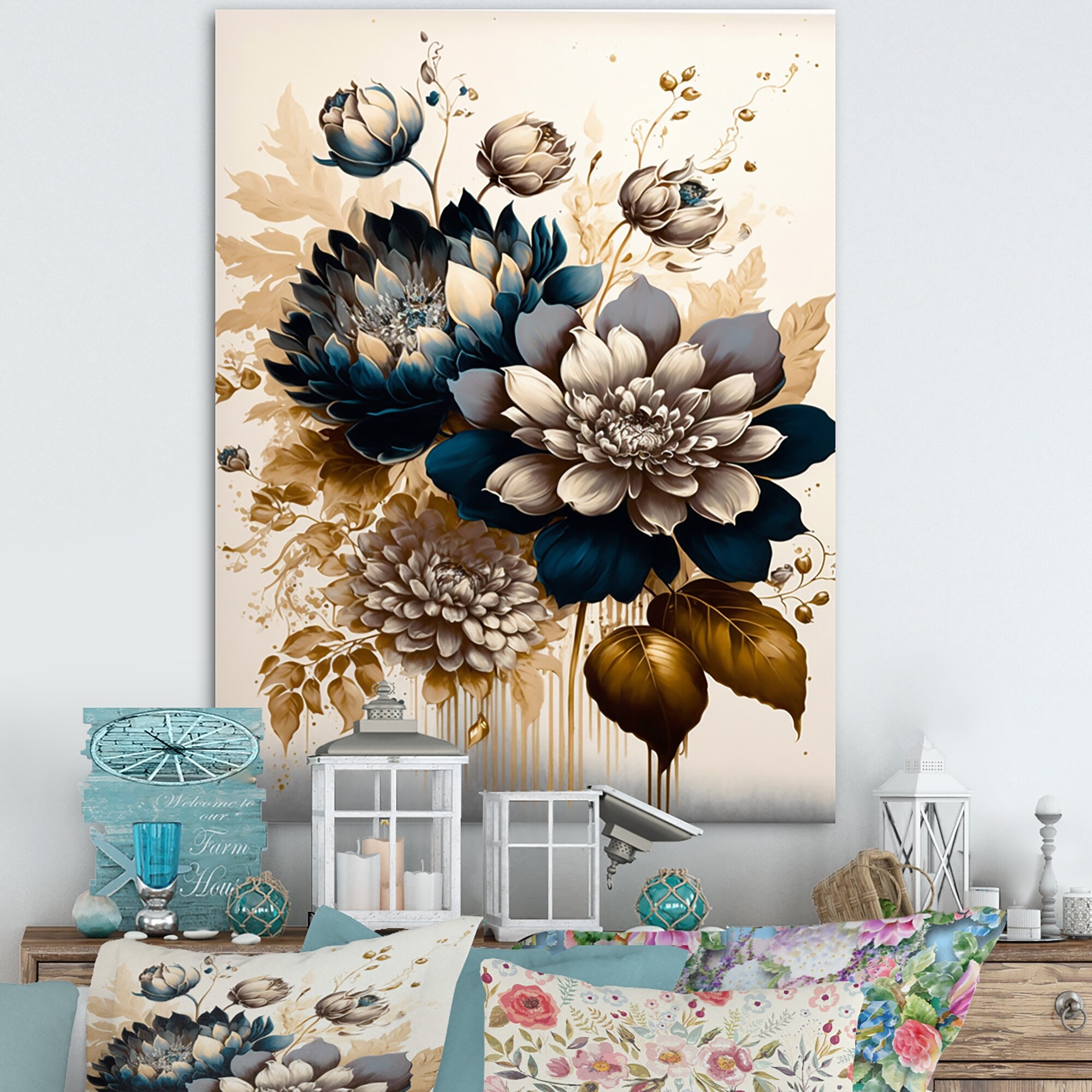Designart 'Blue And Gold Dahlia Bunch I' Floral & Botanical Canvas Wall Art