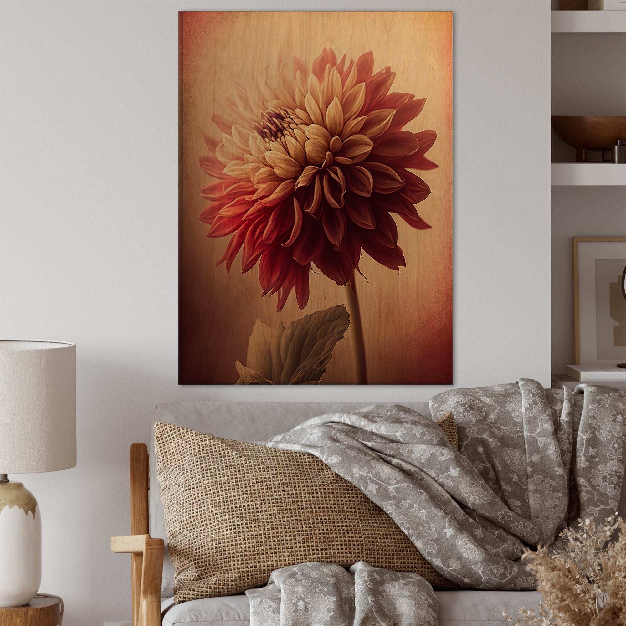 Designart 'Orange Dahlia Flower VI' Floral Dahlia Wood Wall Art - Natural Pine Wood