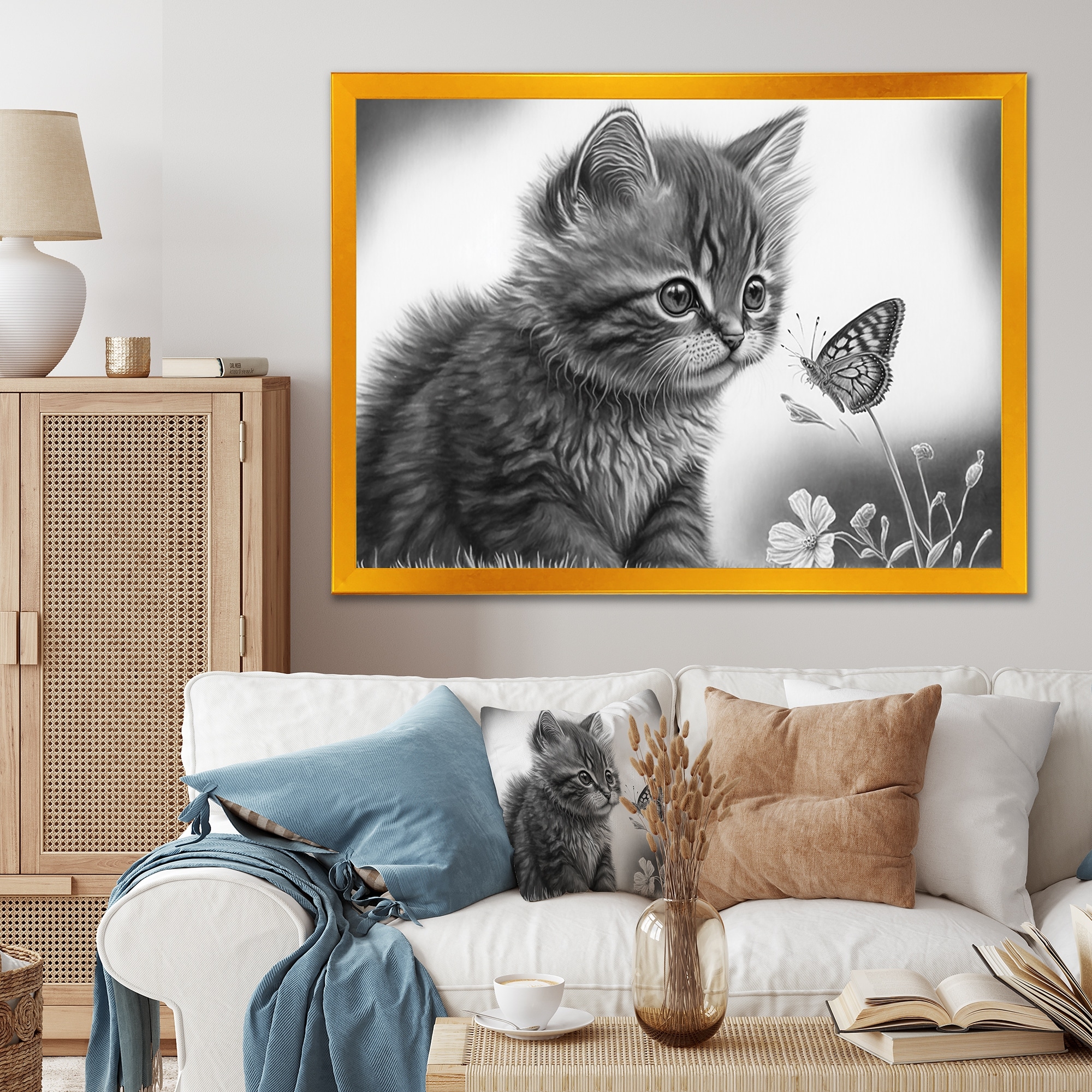 Designart "Digital Drawing of Little Kitten With Butterfly IV" Animals Cat Framed Art Print