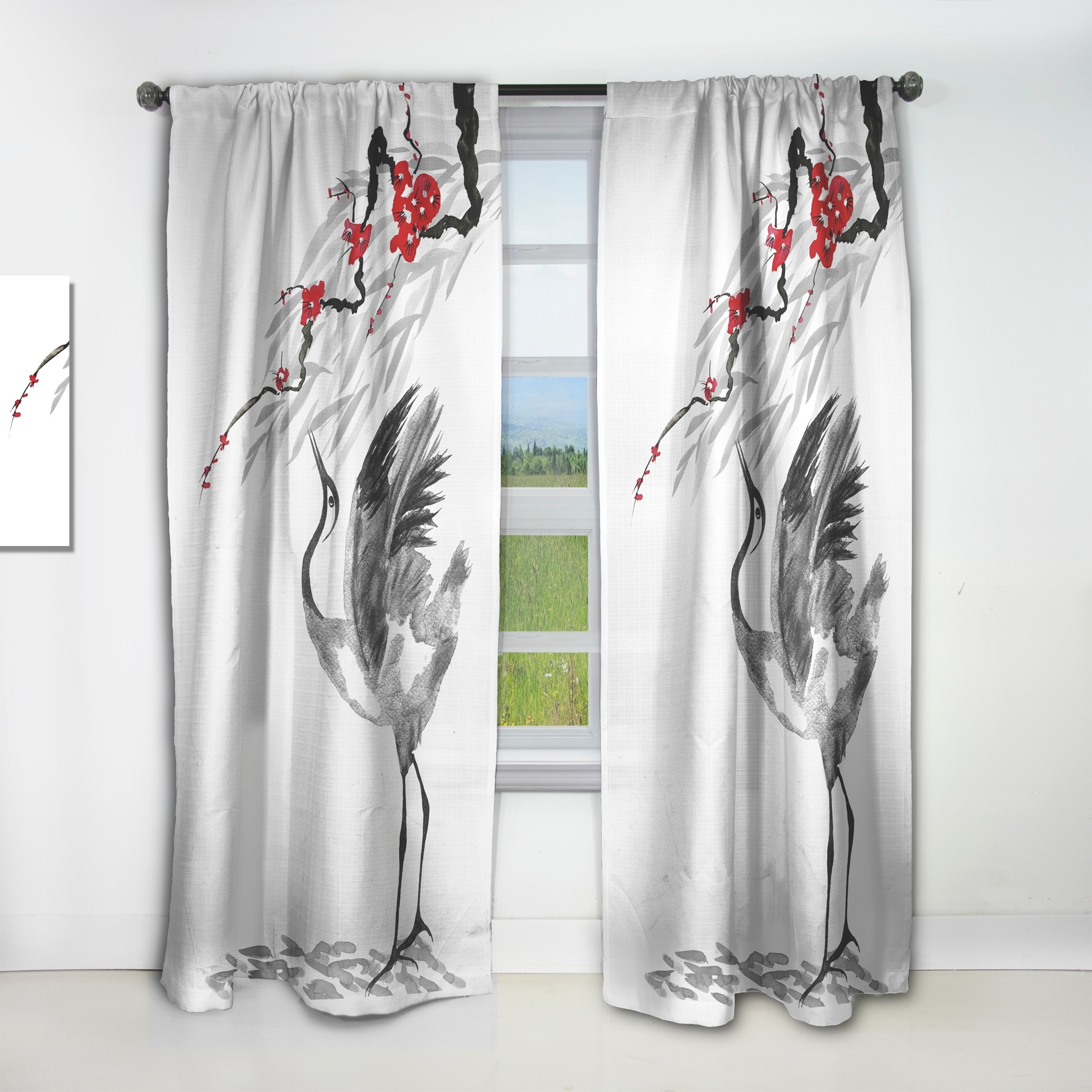 Designart 'Japanese Cranes Bird Drawing With Red Flowers' Traditional Curtain Single Panel