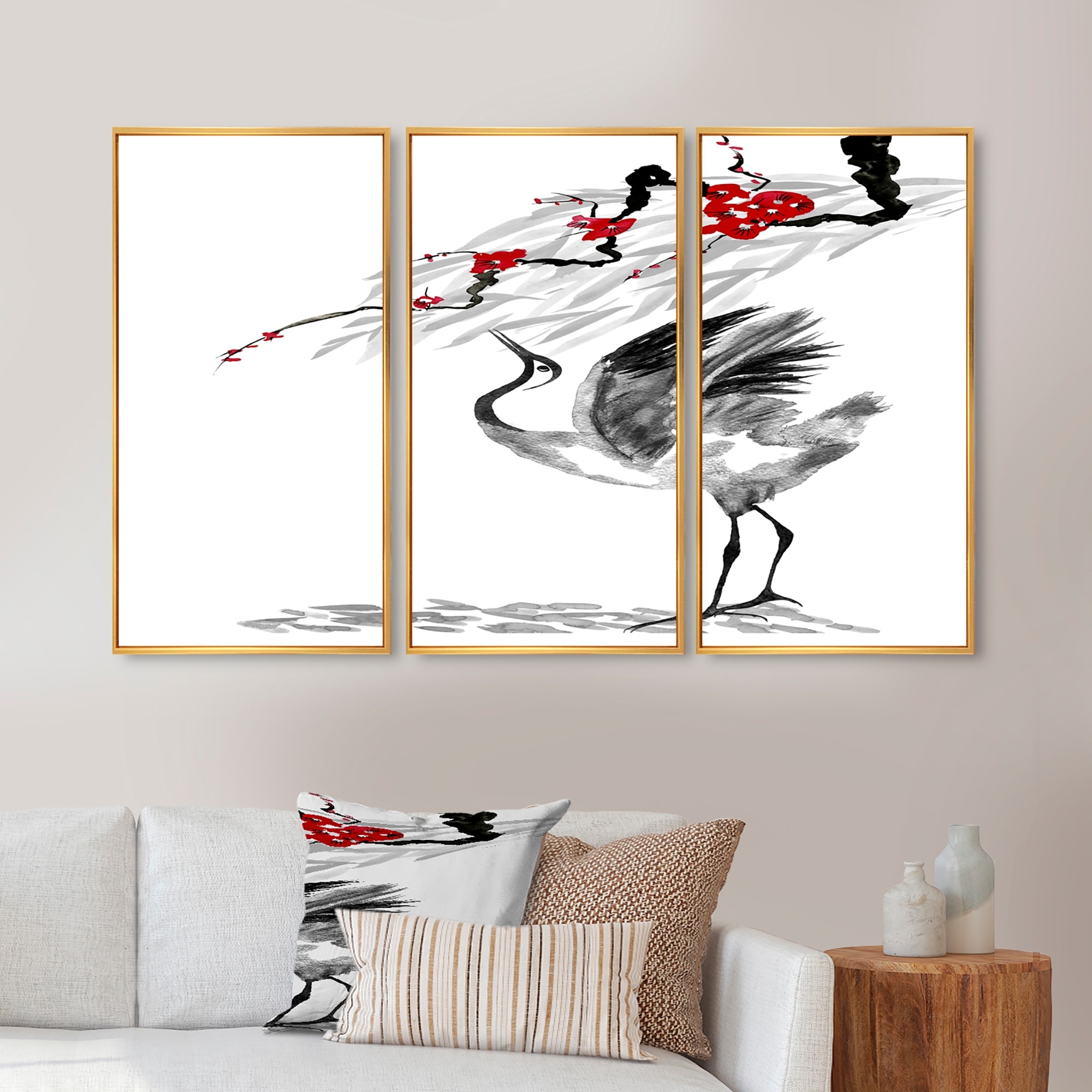 Designart "Japanese Cranes Bird Drawing With Red Flowers" Traditional Framed Artwork Set of 3 - 4 Colors of Frames