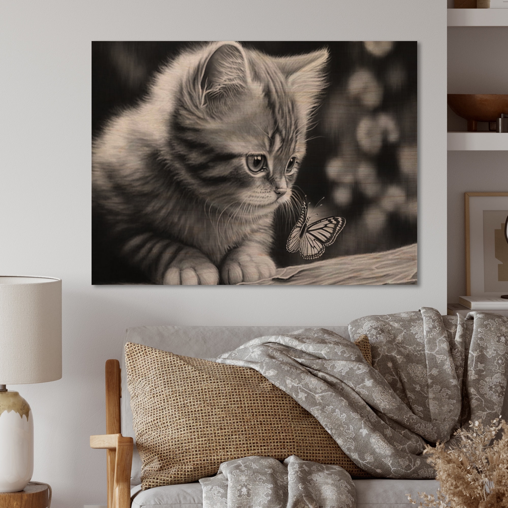 Designart 'Monchrome Digital Drawing of Little Kitten' Animals Cat Wood Wall Art - Natural Pine Wood