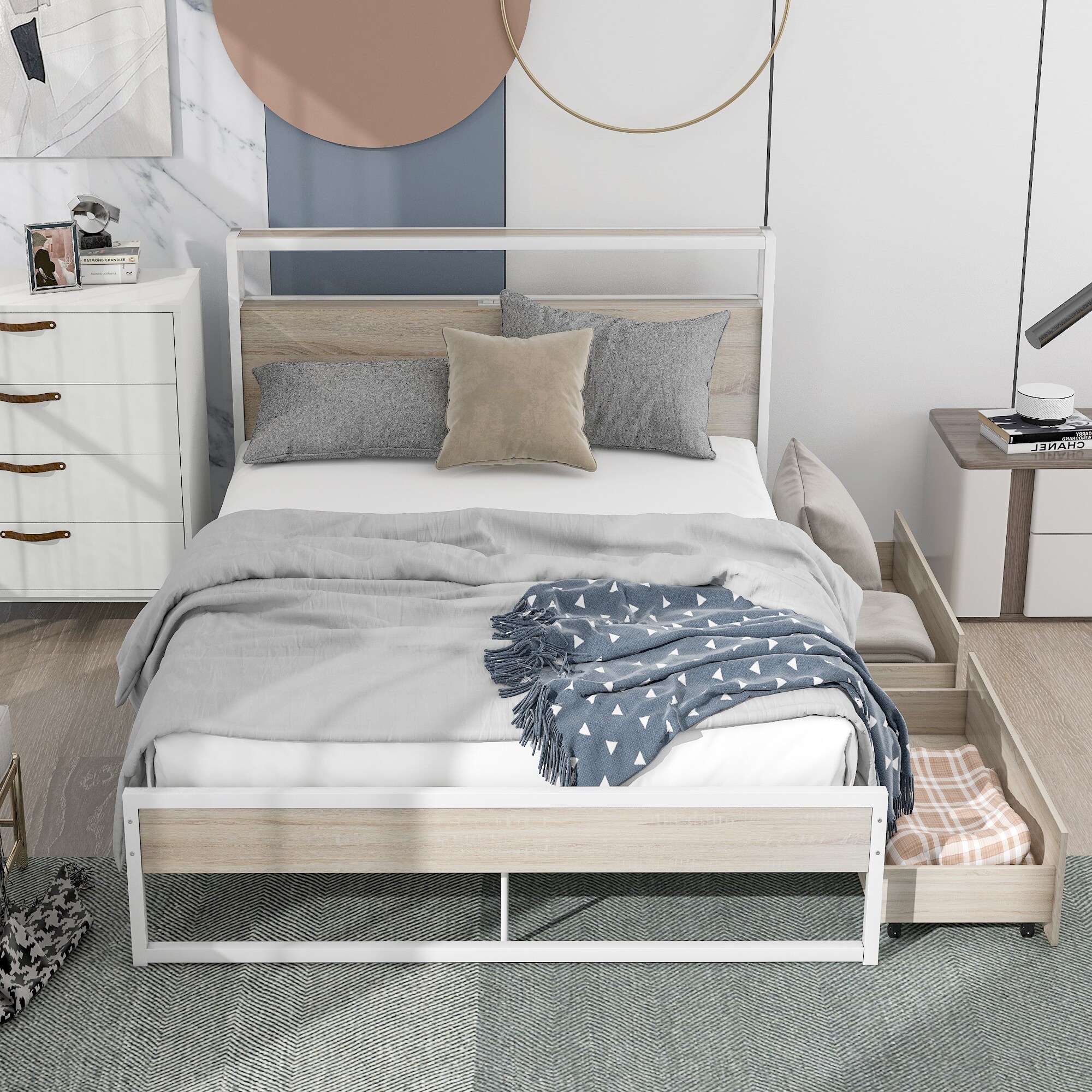 Queen Size Platform Bed with Headboard and 2 Storage Drawers, White