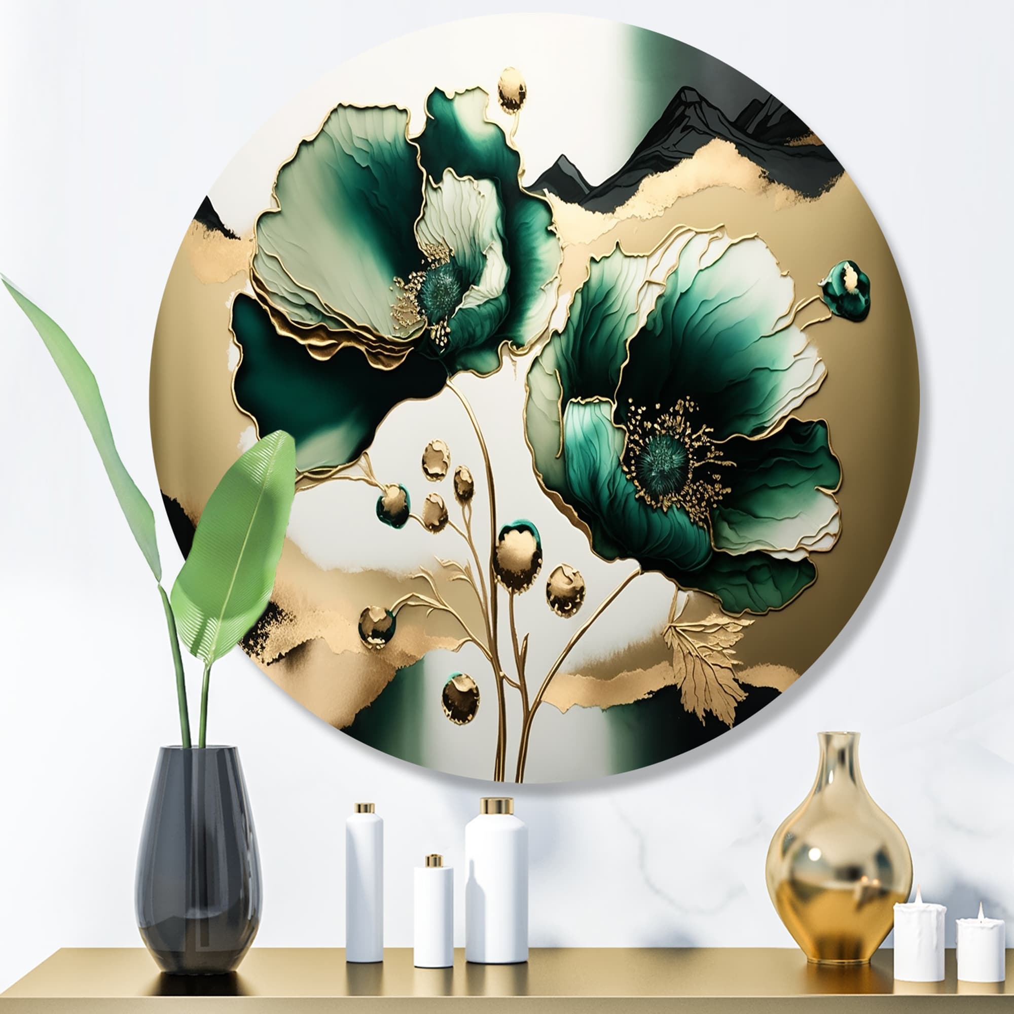 Designart "Gold And Green Poppy Floral Euphoria I" Floral Poppy Metal Round Wall Art