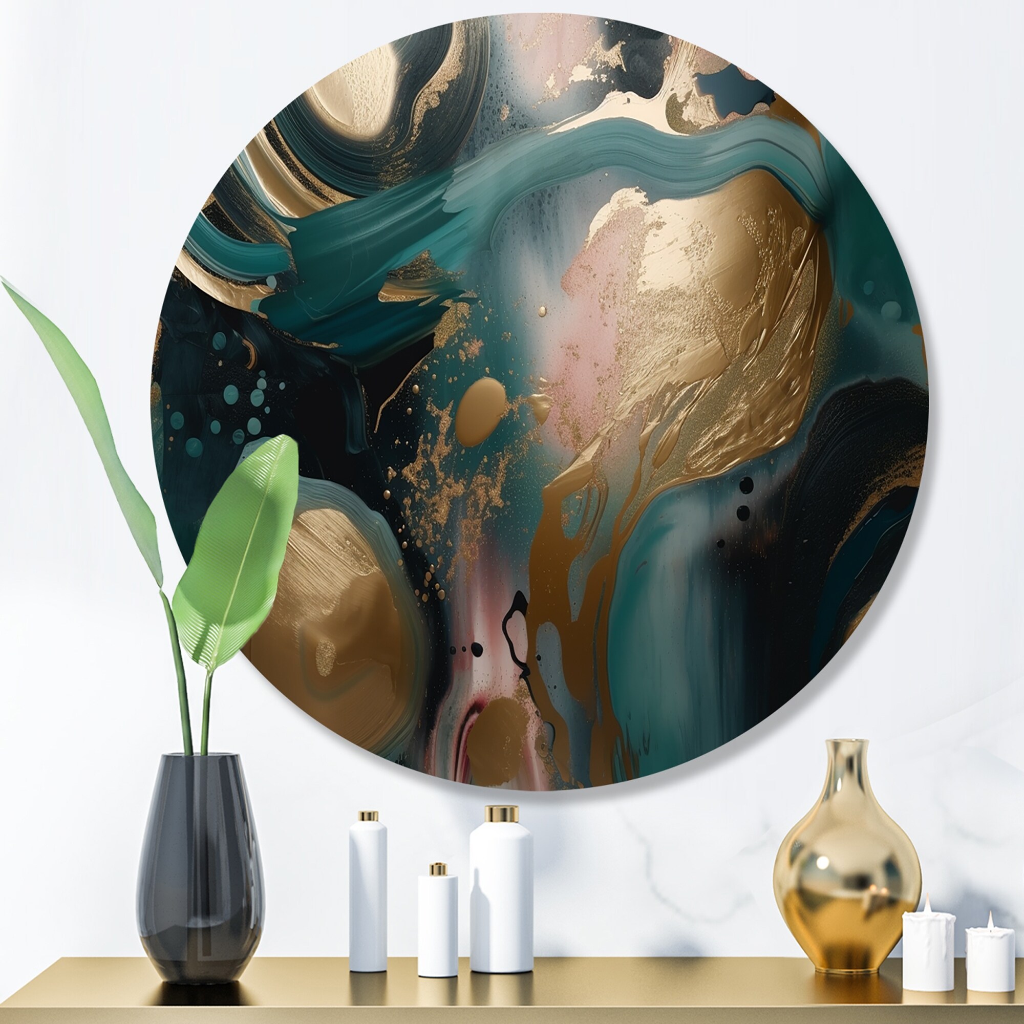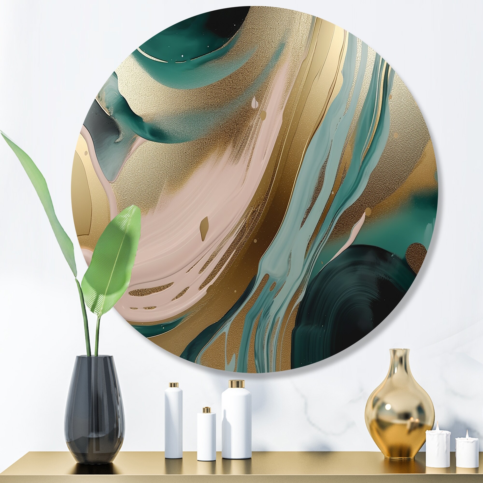 Designart "Gold And Green Marbled Euphoria V" Abstract Marble Metal Round Wall Art