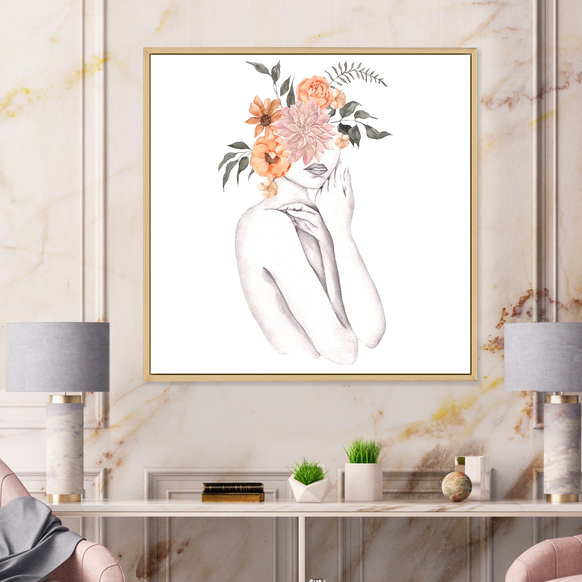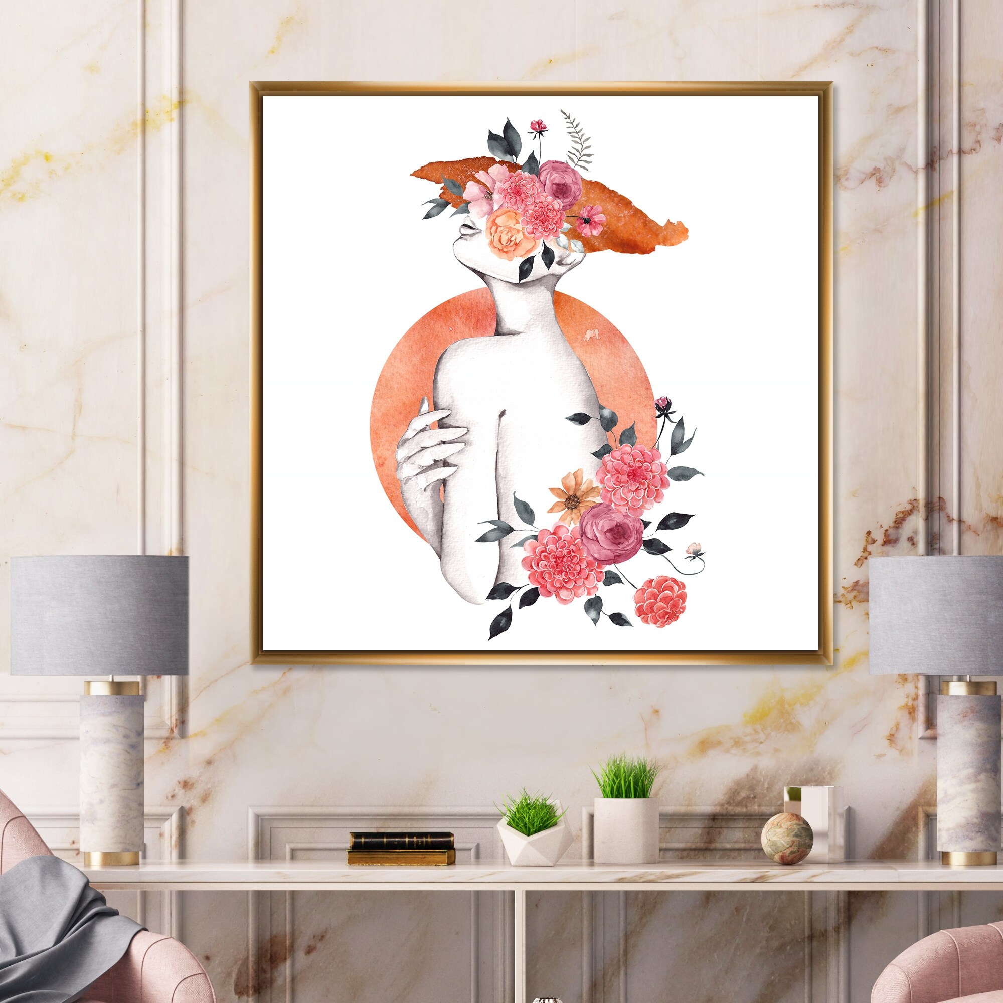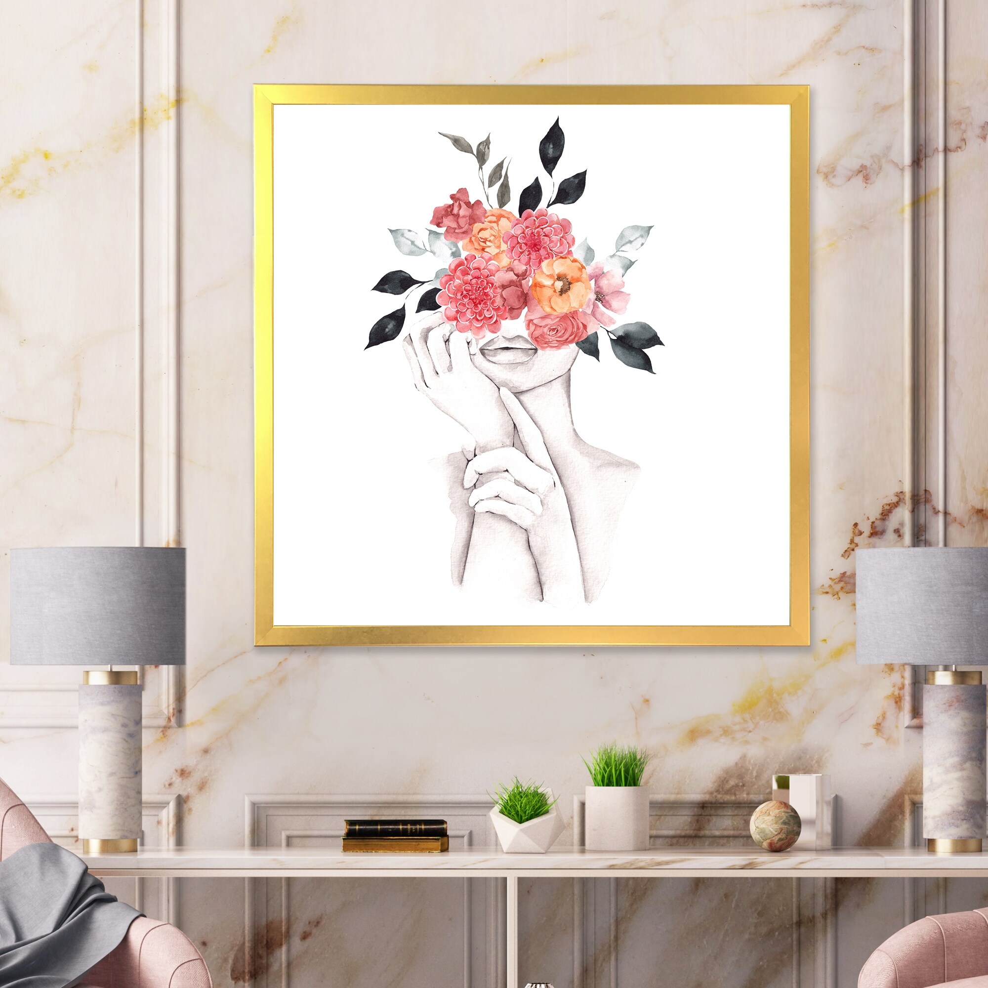 Designart "Woman Silhouette With Red And Purple Flowers I" Glam Framed Canvas Wall Art Print