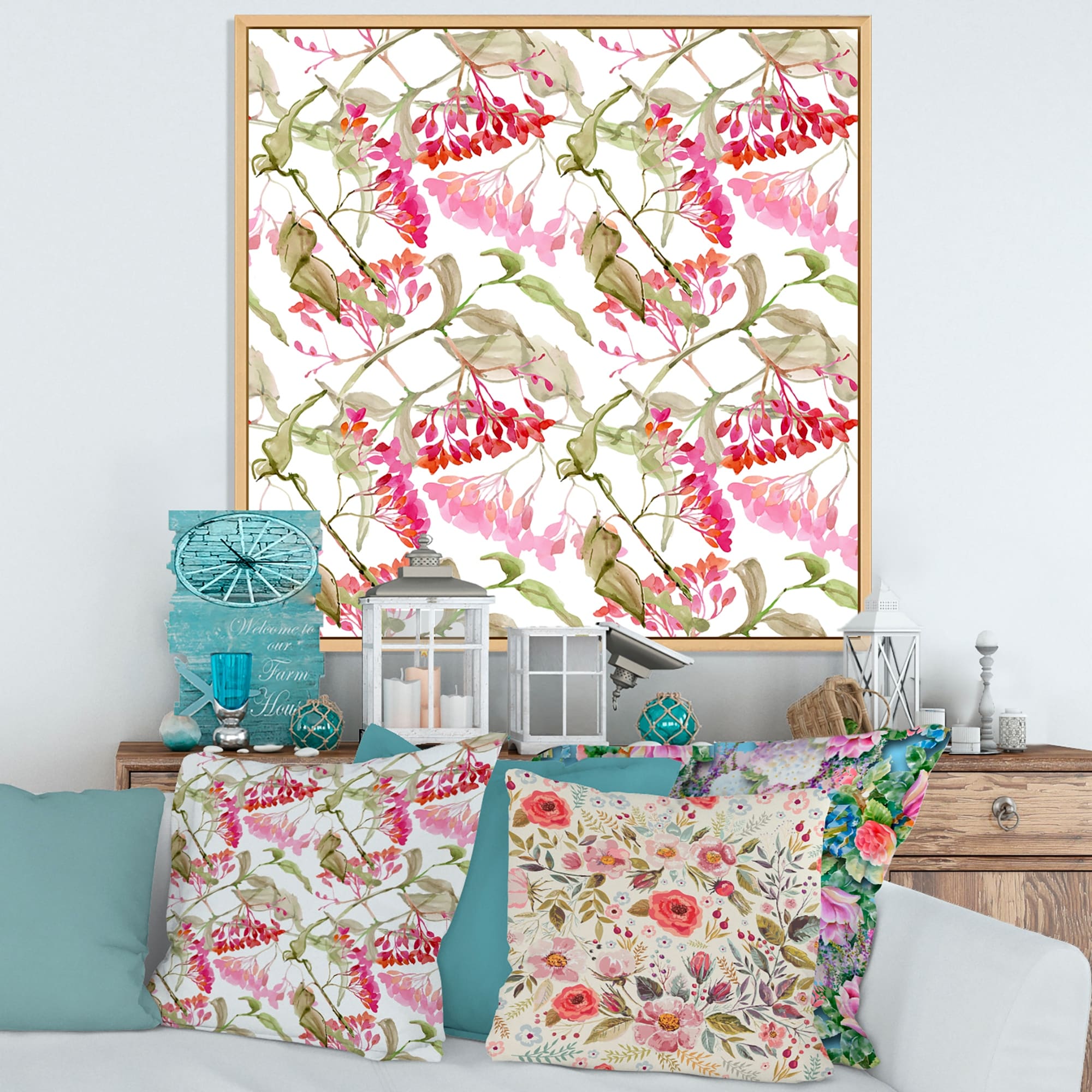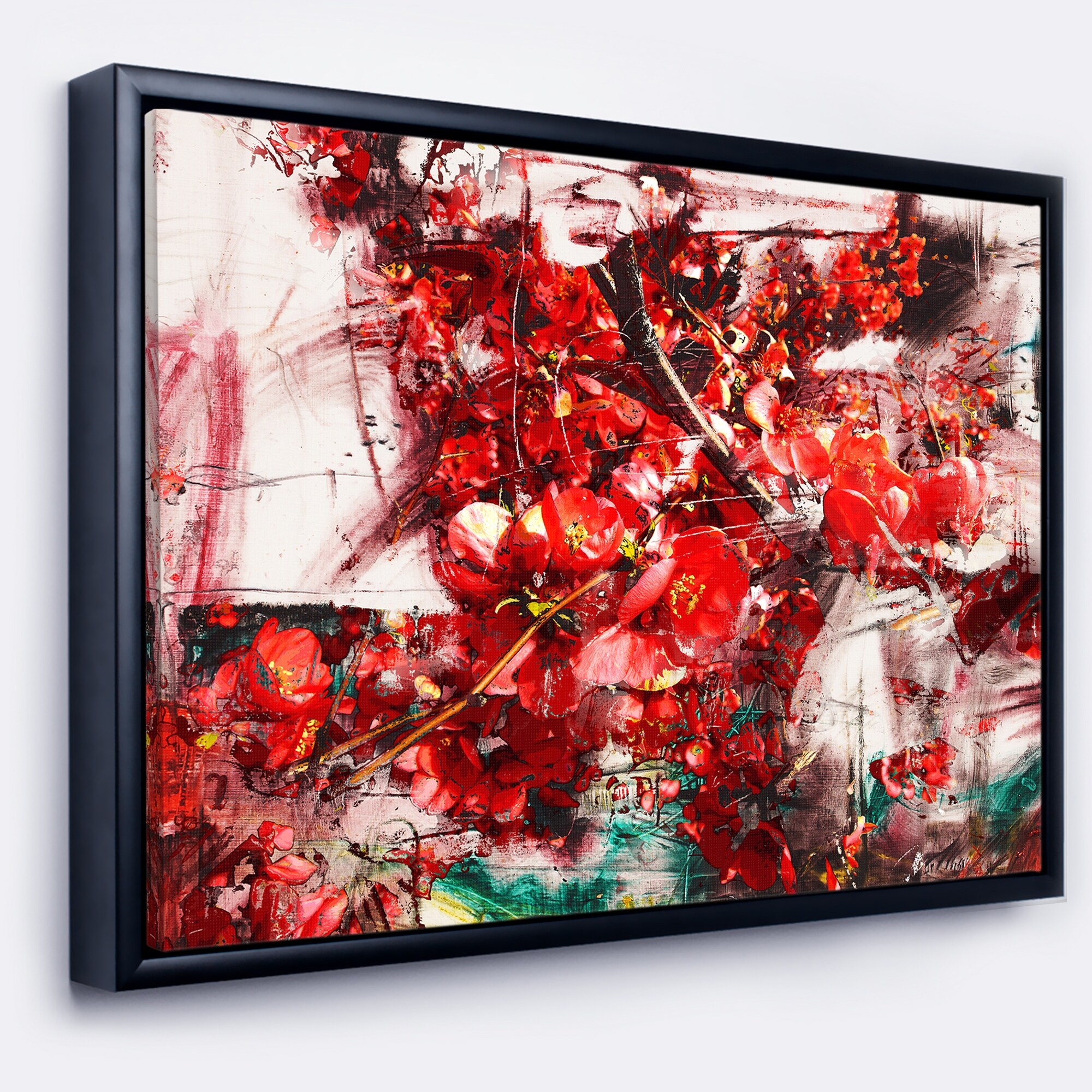Designart "Blossoming Red Flowers With Green Leaves on White" Patterned Framed Canvas Wall Art Print
