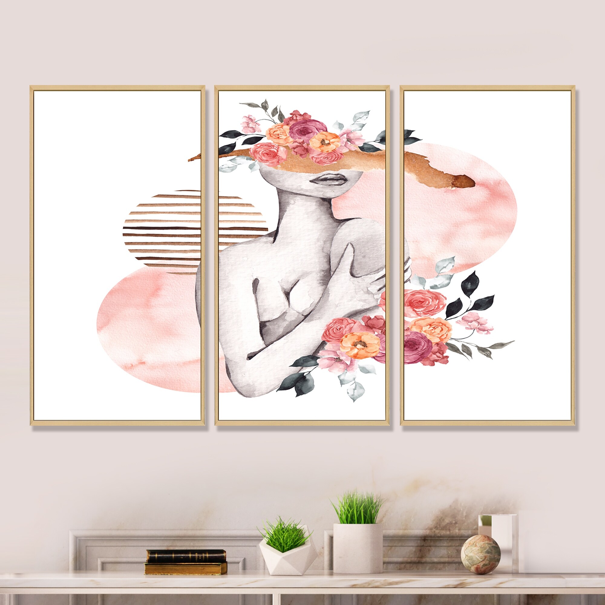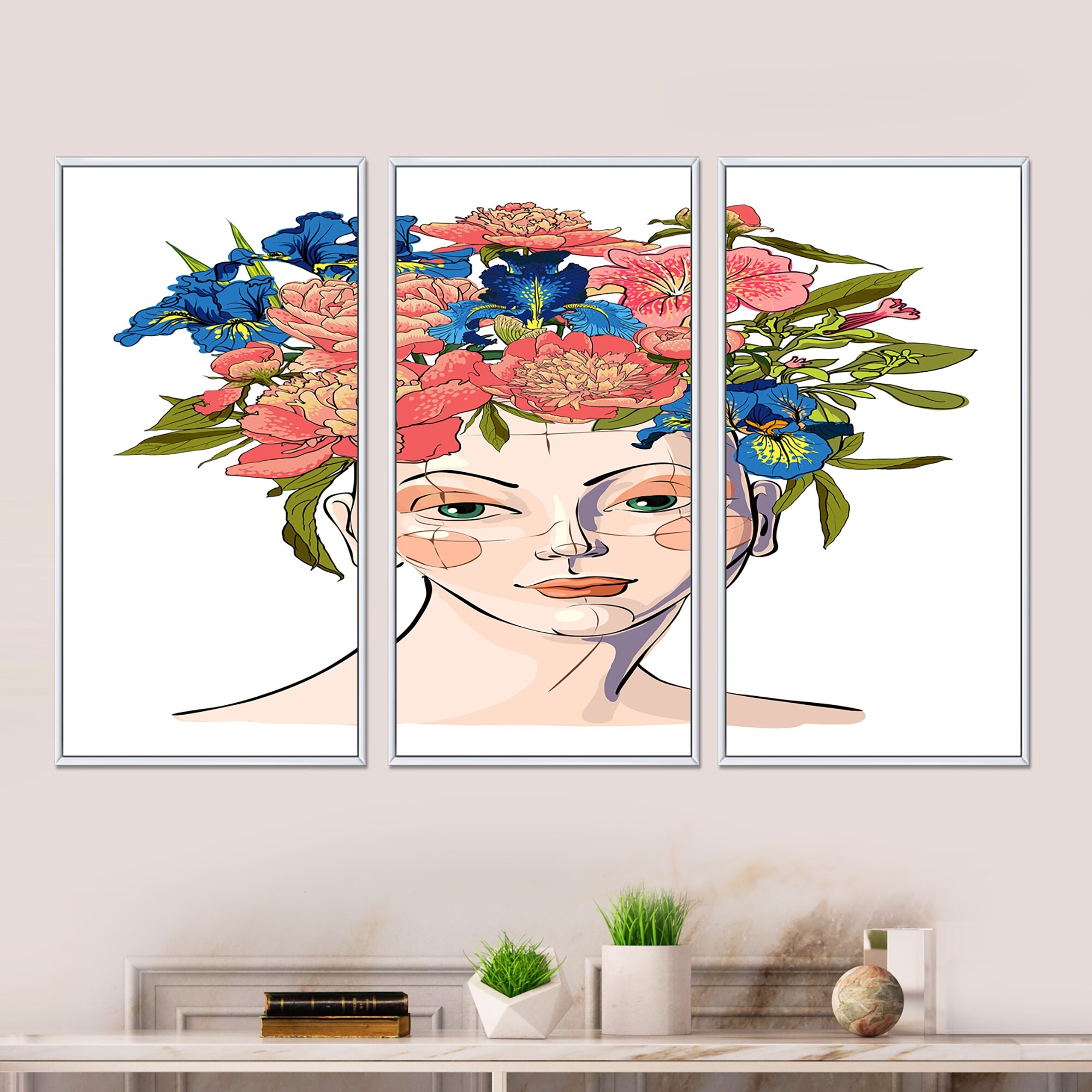 Designart "Portrait Of a Woman With Red Flower Garland I" Modern Framed Wall Art Set of 3 - 4 Colors of Frames