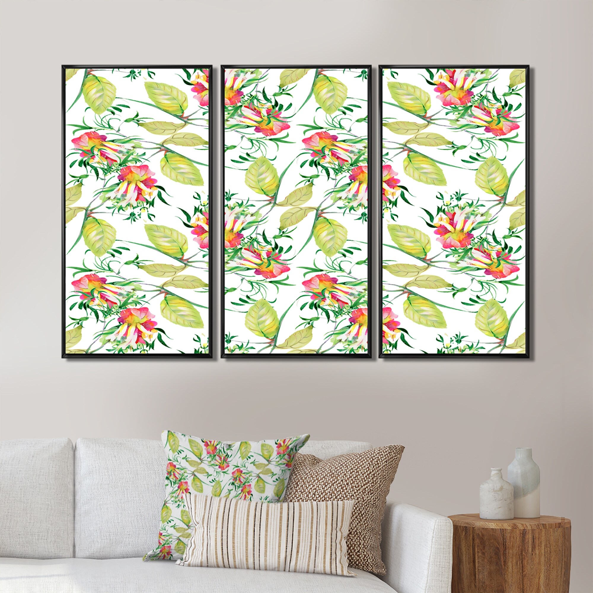 Designart "Red Flowers With Green Leaves" Patterned Framed Wall Decor Set of 3 - 4 Colors of Frames