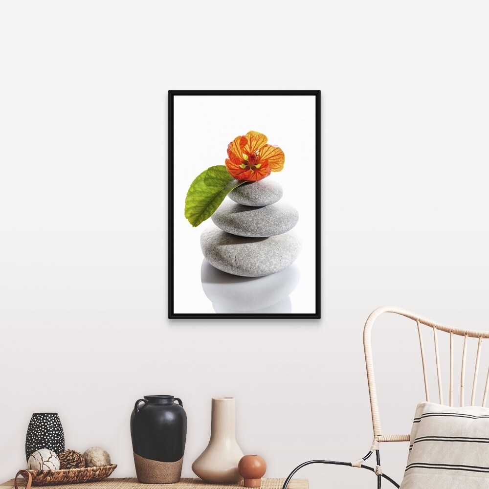 "Balanced stones and red flower" Black Float Frame Canvas Art