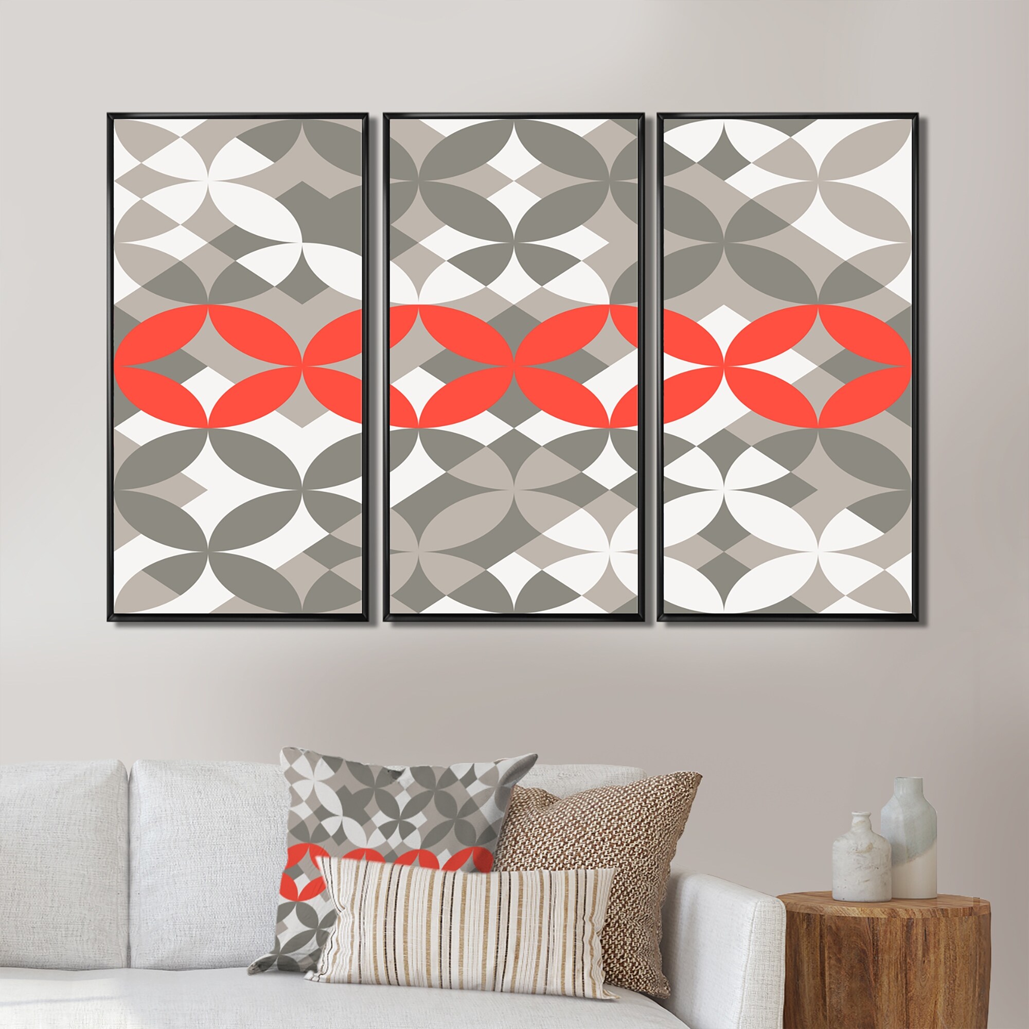 Designart "Red Flower of life on Grey And White" Patterned Framed Canvas Wall Art Print Set of 3 - 4 Colors of Frames