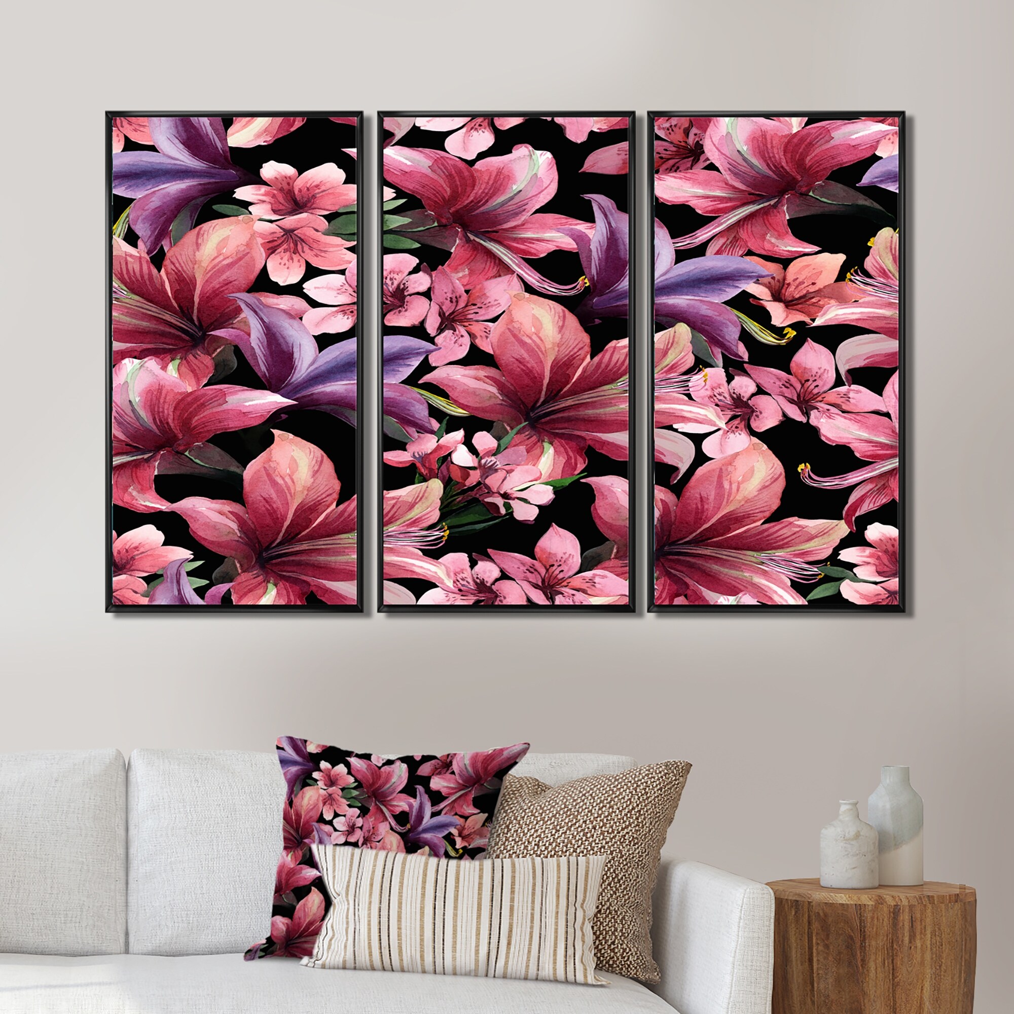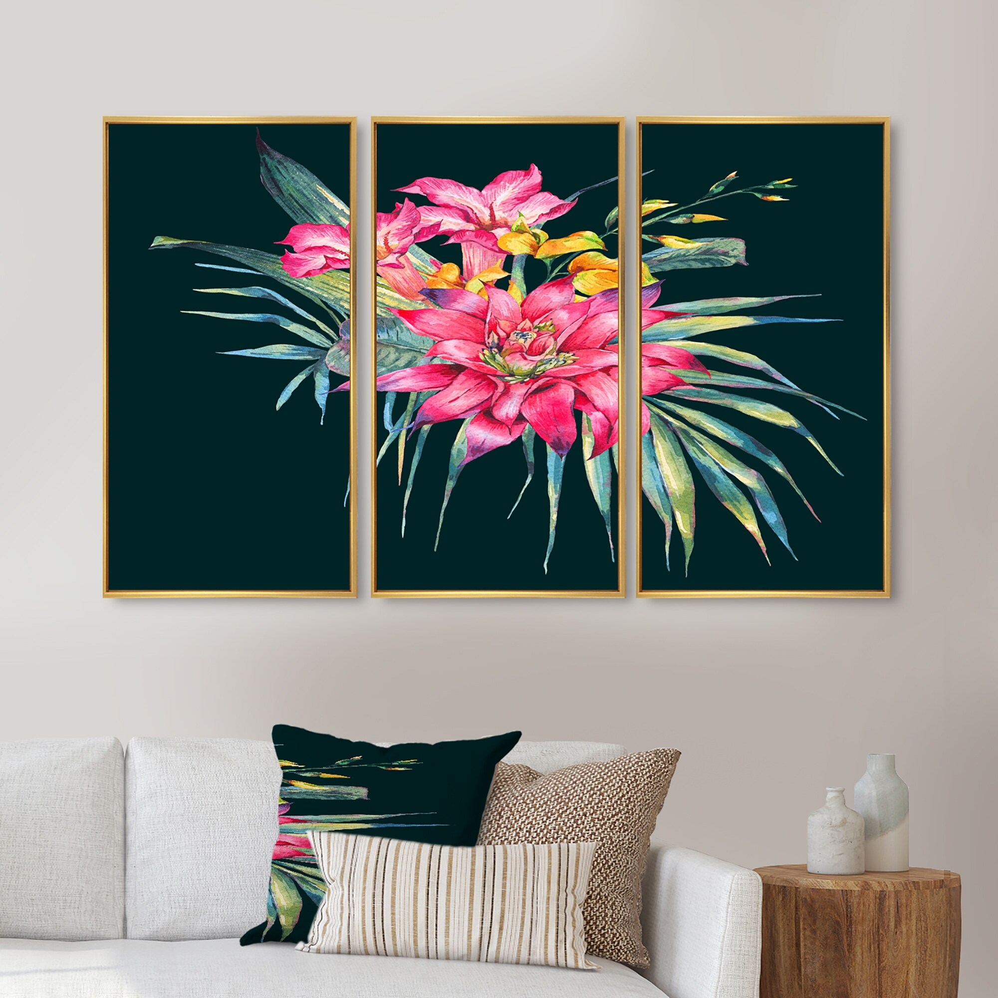 Designart "Tropical Red Flowers on Black I" Traditional Framed Canvas Wall Art Print Set of 3 - 4 Colors of Frames