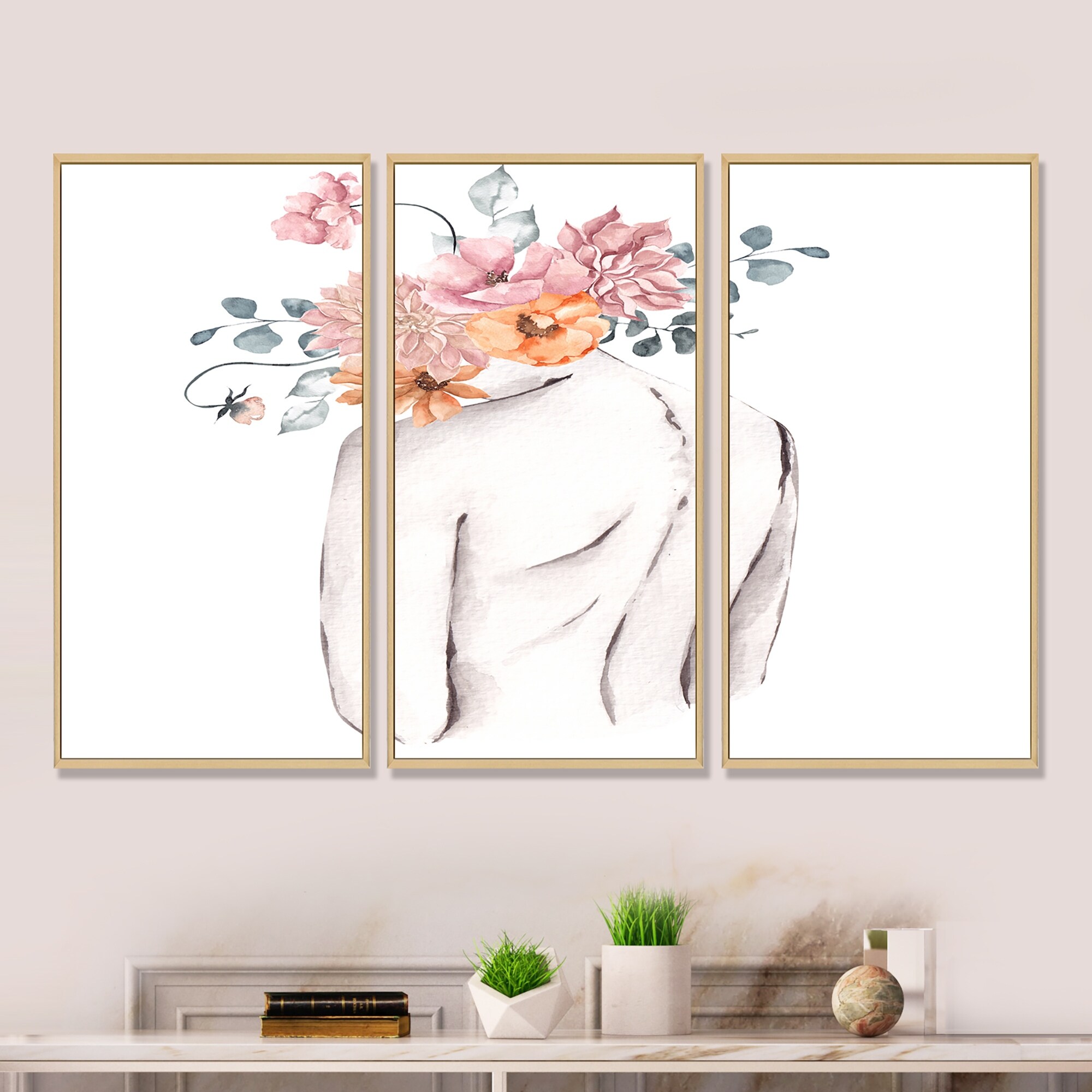 Designart "Woman Silhouette With Red And Purple Flowers IV" Glam Framed Art Set of 3 - 4 Colors of Frames